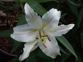 Abstammung:Seedlling no. 553 x seedling no. 201Beschreibung:Inside greenish to yellowish white (155C/D) with deep red (185A) midveins and throat strong yellow-green (144C), outside greenish white (155C) with pale yellow-green (4D) midveins; deep red (185A) spots; nectaries dark purple/strong purplish red (79A/72A); pollen strong reddish orange/strong orange (169A/B). Fls 230mm wide; petals slightly ruffled, slightly recurved. Lvs alternate, 185 x 38mm, mid green. Stems 1.24m, green, with c5 fls.Züchter:Vletter & Den Haan Beheer B.V.Bezug:Salzborn: 2003,2008; Mathys: 2011;