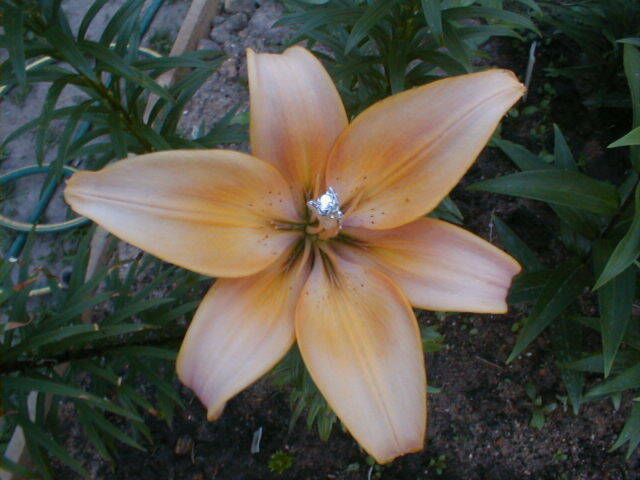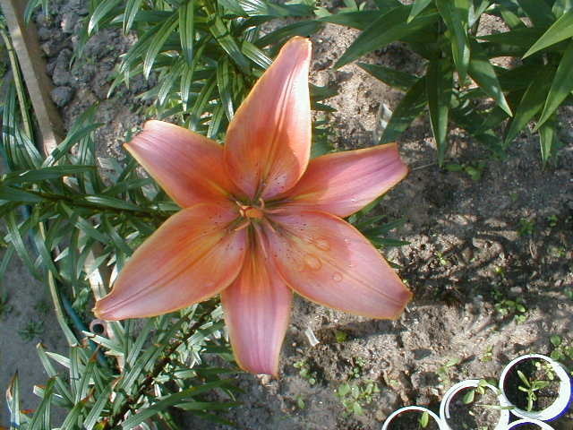 Abstammung:Unnamed Asiatic seedling X Berliner Morgen Beschreibung:Inside strong orange (169C), shading to pale orange-yellow (159B) at tips; outside pale apricot; spots numerous, small, dark red (59A) over the basal three-quarters of each petal, brushmarks small, dark red (59A); nectaries pale yellow (158B), hoary; pollen moderate reddish orange (171A); stigma moderate orange (170C). Fls 100 mm wide, star-shaped; petals 45 x 29 mm, margins smooth, tips not recurved. Lvs alternate, 80 x 14 mm. Stems 0.65 m, dark green, with 5-8 fls. Mid July. (Published in ELG: sales list, 2001. Nomenclatural standard: colour print provided by registrant (WSY 0038765).)Bezug:Salzborn: 2001,2002,2003,2004,2005,2006,2007,2008,2011;