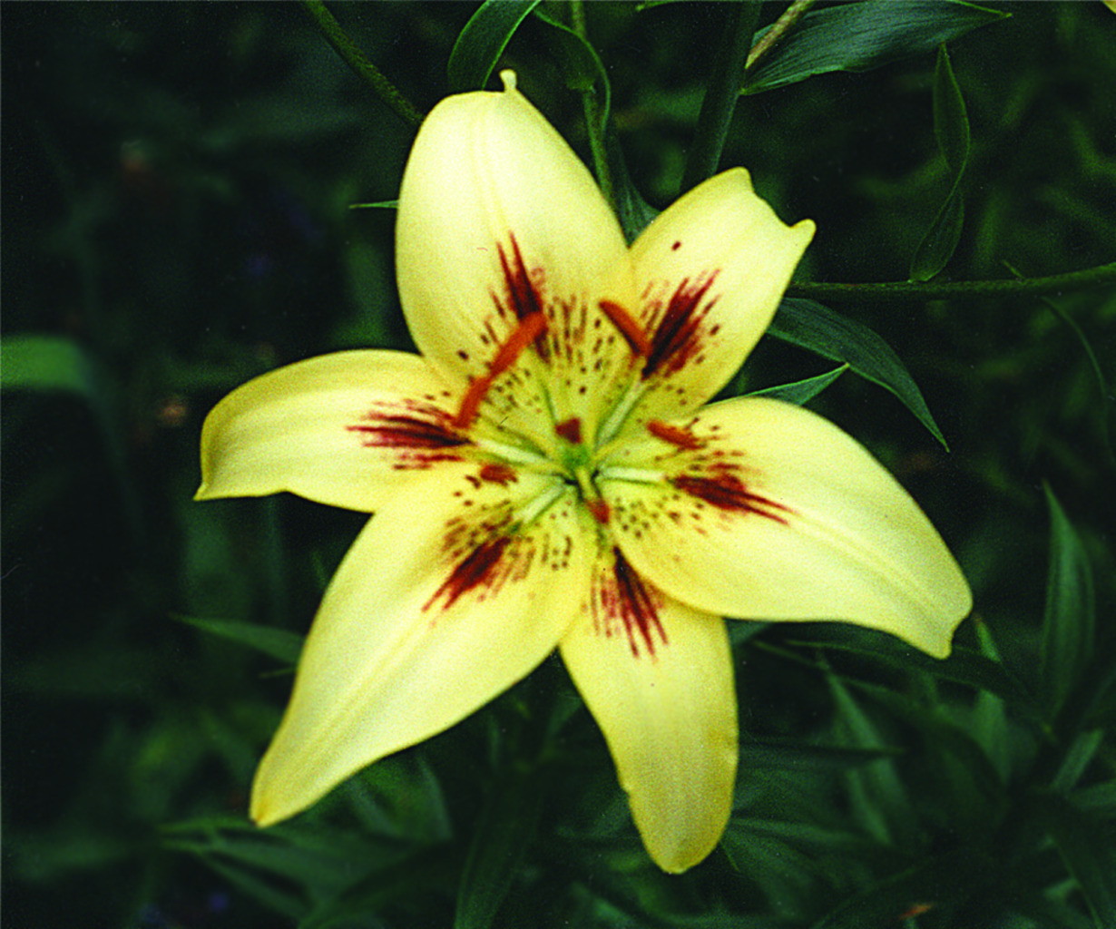 Abstammung:Dawn Star x asiatic seedlingBeschreibung:Inside strong greenish yellow (153C), pale yellow (160D) towards tips, throat 153C; outside moderate yellow (160A); many very small, strong red (46A) spots on basal half of each petal; nectaries soft yellow-green; pollen dark reddish orange (175C); stigma dark red (59A), style vivid yellow-green (154A). Fls 150mm wide; petals 55 x 30mm, not ruffled, not recurved. Lvs alternate, 100 x 10mm. Stems 0.8m, dark green to black, with c15 fls on unusually long, horizontal, unbranched pedicels. Mid-late JulyBezug:Salzborn: 1999,2000;