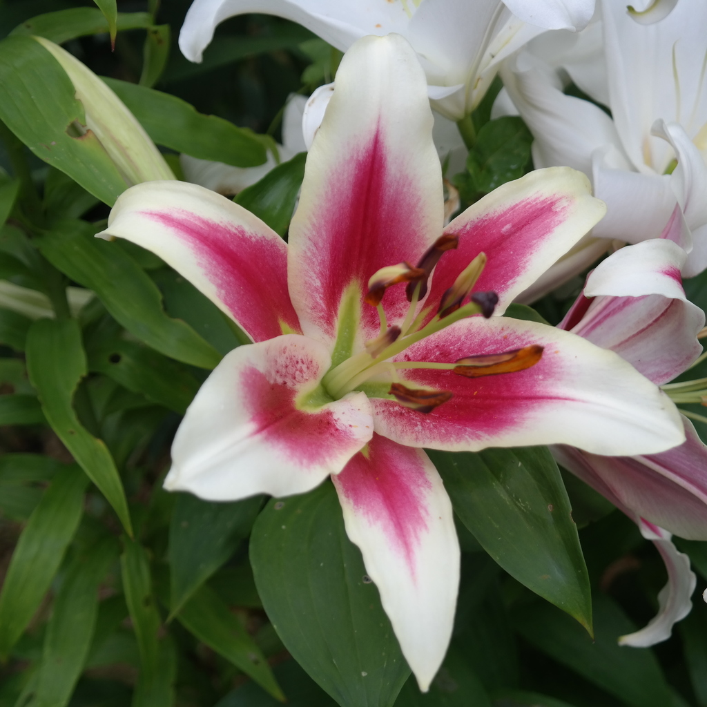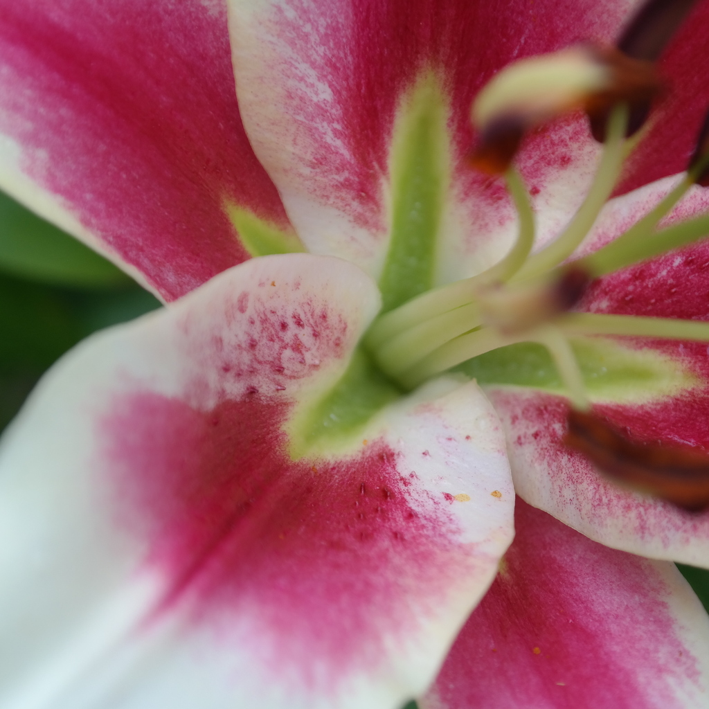 Abstammung:‘Karuna’ × unknownBeschreibung:Inside of tepals opening purplish pink with narrow white margins, ageing to light greenish yellow (3D) with a strong purplish pink (62A) patch at the tip; throat strong yellow-green (143C). Outside of outer tepals opening purplish pink, strong yellow-green (143C) at base and as spot at tip when midrib indistinct, ageing to yellowish grey (156C); midribs (when showing) very narrow, purplish pink shading to strong yellow-green (143C) at top. Outside of inner tepals strong purplish pink (62A), darker alongside midribs, shading towards margins to yellowish grey (156C) background behind heavy spotting, and strong yellow-green (143C) at base; midribs prominent, strong yellow-green (143C) at base, yellowish grey (156C) above, increasingly flushed strong yellow-green (143C) towards tip. Spots numerous, strong purplish pink (62A), variable in size and shape (some elongated) but mostly small, inside over all but base and tip-patch, outside largely restricted to margins of inner tepals; papillae absent; nectaries strong yellow-green (143C), with long furrows extending up to two-thirds of midvein; pollen orange; ovaries brigh green; style plum-purple; stigma light greenish grey (188B) flushed purple. Fls 55–65mm wide, slightly to strongly scented; tepals 30–35 × 15–18mm, margins smooth, tips slightly recurved; pedicels strong yellow-green (143C) with a few purplish pink spots towards top. Lvs 130–160 × 55mm, whorled. Stems 1.1m, green, with up to 15 fls. Mid- to late June.