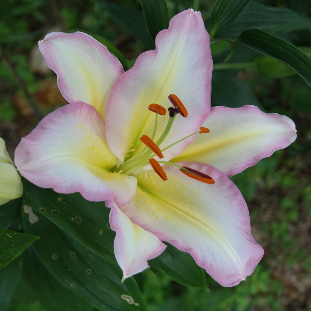 Abstammung:L. henryi x Palmer hybrid no. 56227Beschreibung:Rich orange, paler outside, ribs beige, base greenish; large orange papillae over 1/3 of each petal; nectaries dark olive green; pollen chocolate. Fls 145mm wide, semi-pendent; petals 95 x 33mm, slightly recurved, slightly waved. Lvs 165 x 22mm, mid, glossy green. Stems 1.2m, dotted dark violet brown. Early August.Bezug:Salzborn: 1997,2000,2002,2003,2004,2006,2007,2012,2013; Wistuba: 2021;