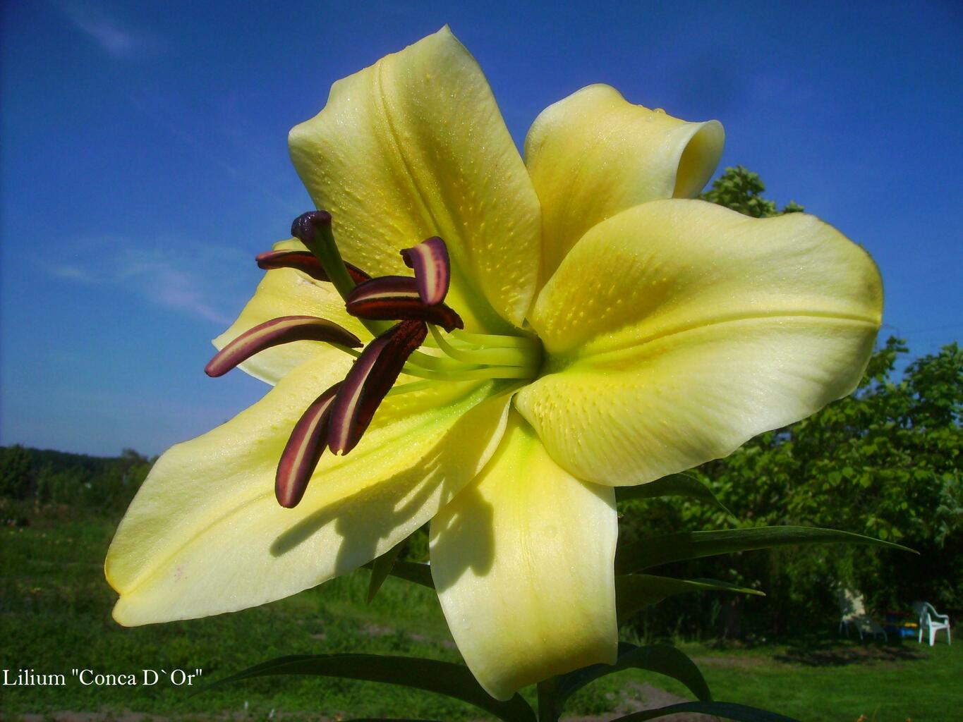 Abstammung:Lime Ice x Argusauge Beschreibung:Inside moderate yellow (162A) with a soft green tinge, throat moderate yellow (162A); outside moderate yellow (162A), with whitish yellow-green midribs; numerous, small, dark red (183A) spots on basal 3/4 of each petal; nectaries strong greenish yellow (153C); pollen dark red (183A), anthers on brilliant greenish yellow (151D) filaments; stigma strong red (53C) on a brilliant greenish yellow (151D) style. Fls 170mm wide, star shaped; petals 85 x 40mm, tapering to a narrow apex, not ruffled, not recurved. Lvs alternate, thickly clothing the stem, 120 x 20mm. Stems 0.9m, dark green, with c.18 fls, including secondaries, in a large inflorescence. Late June. (Standard: colour print provided by registrant (WSY 0028879). First published in Steinbruck's bulb list, 2000. Etymology: the epithet refers to some music of Tchaikovsky.)
