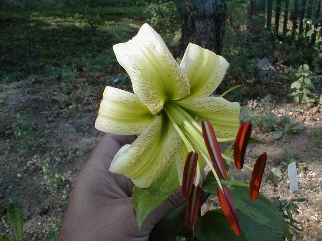 Abstammung:(Bright Star x (Henrietina x Mimosa Star ))Beschreibung:Inside pale yellow, tips whitish; outside with pale green ribs; cinnamon dust-like spots over fi of each petal; nectaries dark green, with papillae beside them; pollen apricot brown; stigma green. Fls 85mm wide, turk's-cap-shaped; petals 95 x 30mm, strongly recurved, wavy-edged. Pedicels 90mm long, thin, brown dotted; with secondary buds. Lvs altcrnate,120 x 30mm, pale green, dull. Stems 0.85m, thick, rigid, strongly brown-red dotted and with a short inflorescence. Mid July.Bezug:Salzborn: 2000;