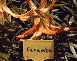 Abstammung:L. henryi x Palmer hybrid no. 56227Beschreibung:Rich orange, paler outside, ribs beige, base greenish; large orange papillae over 1/3 of each petal; nectaries dark olive green; pollen chocolate. Fls 145mm wide, semi-pendent; petals 95 x 33mm, slightly recurved, slightly waved. Lvs 165 x 22mm, mid, glossy green. Stems 1.2m, dotted dark violet brown. Early August.Bezug:Salzborn: 1997,2000,2002,2003,2004,2006,2007,2012,2013; Wistuba: 2021;