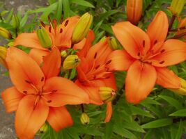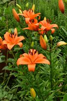 Abstammung:(Napoli (tetraploid) x Gran Paradiso )Beschreibung:Inside vivid orange (28B) and strong orange (30C); outside strong orange (30C); a few small spots and some papillae present; nectaries orange; pollen reddish brown; stigma purple. Fls 220mm wide; petals 110 x 40mm, margins slightly ruffled, tips slightly recurved. Lvs alternate, 150 x 16mm, mid green. Stems 1.25m, green, with dark stripes and spots and with 7-9 fls (from a 16/l8cm bulb).June.Bezug:Salzborn: 2001,2003,2004;