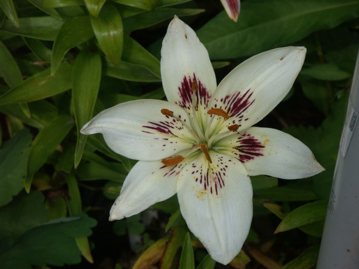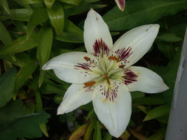 Abstammung:UnknownBeschreibung:Inside yellowish white (155D) with dark red (187B); outside yellowish white (155D); spots and papillae present; nectaries green; pollen light brown; stigma purple. Fls 170 mm wide; petals 90 x 45 mm, margins slightly ruffled, tips slightly recurved. Lvs 140 x 15 mm. Stems 0.95 m. Midseason.Bezug:Salzborn: 2004,2008; Mathys: 2011; Wistuba: 2019,2020;
