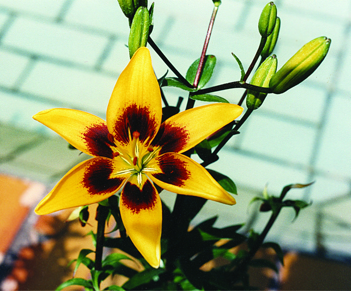 Abstammung:(Sundrop Group x Sterling Star ) x yellow seedling with a brushmark))Beschreibung:Inside vivid yellow (15A), with a small, spotted dark red (187B) brushmark and a vivid yellow (9B) throat; outside vivid yellow (15A), flamed light greenish yellow (3C); stigma dark red (59A); pollen brownish orange (165B); nectaries green. Fls 150mm wide; petals 75 x 25mm, not ruffled, tips slightly recurved. Lvs alternate, 125 x 16mm. Stems 0.9m, green, with darker markings and 6-10 fls. July. (Unacceptable name (Art. 17.2).)Bezug:Salzborn: 1996,1999;