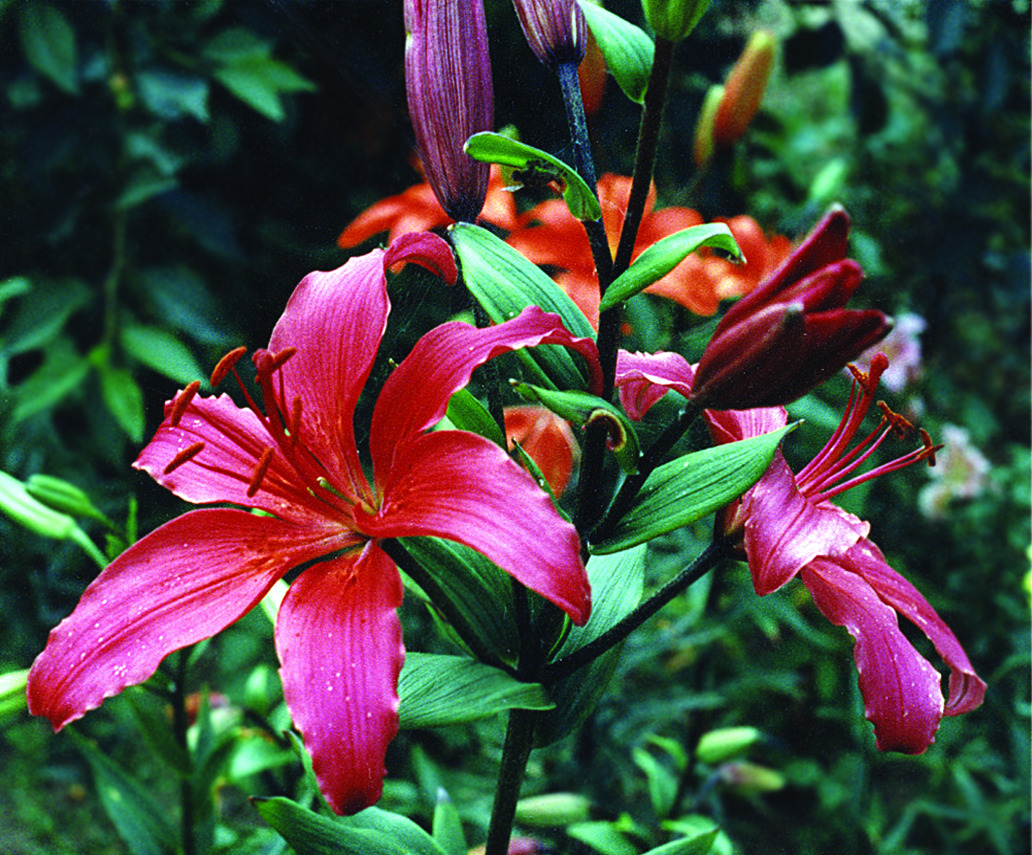 Abstammung:UnknownBeschreibung:Deep rose pink (Red 48A); tips 48A, throat light pink, outside Red 46C; very few brown spots; nectary orange blush; pollen light tan. Petals 80 x 35mm, not ruffled, not recurved. Lvs alternate, 100 x 15mm, dark green. Stems 1.2m, dark green, with 7-9 fls. Late.