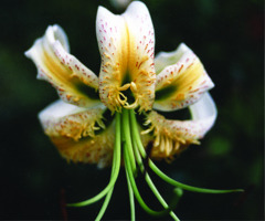 Abstammung:L. henryi × a mixture of pollen from Oneida , Lady Jane and L. × kewense White Henryi Beschreibung:Inside of tepals yellowish white (155D) with light yellowish pink (159A) central flare along and beside midvein in basal third. Outside of tepals white with mid-green midribs. Spots small, raised, of irregular shape, a few of the uppermost markings dashes, not raised, all reddish crimson, closely and evenly distributed on lower third of each tepal, mostly between the central flare and margins; papillae brilliant greenish yellow (6A); nectaries large, dark green, deep in throat; filaments yellowish white, very long; stamens large; pollen moderate reddish brown (175A); style almost as long as stamens; style and stigma pale yellowish green. Fls 80 mm wide, slightly scented; tepals 75 × 22 mm, margins smooth, tips strongly recurved. Lvs 130 × 30 mm, scattered. Stems 1.25 m, mid-green with reddish light marbling, with up to 15 fls. Mid- to late July (Germany). Named after the city which hosted an international lily exhibition in 2007.Züchter:Gerhard Steinbrück