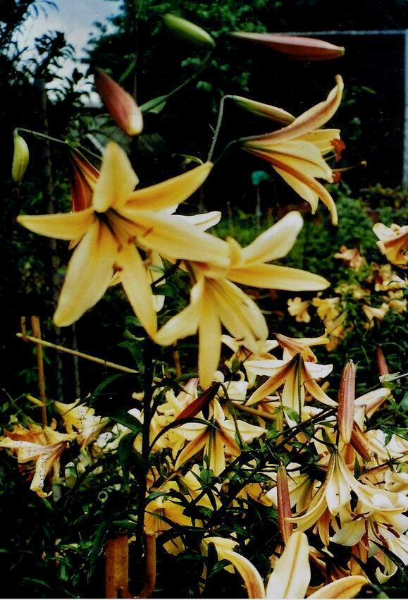Abstammung:L. davidii var. willmottiae x L. pumilumBeschreibung:Yellow-Orange 18C with margins Orange 24D, throat 18B, outside 18C with purple overlay on midribs; few small Greyed-Purple spots over 2/3 of petal; nectaries white; pollen Greyed-Orange 172A. Petals 52 x 20mm, not ruffled, strongly recurved. Fls 60mm wide. Lvs alternate, 74 x 3mm, dark green. Stems 0.8m, purple, with c 10 fls. June.