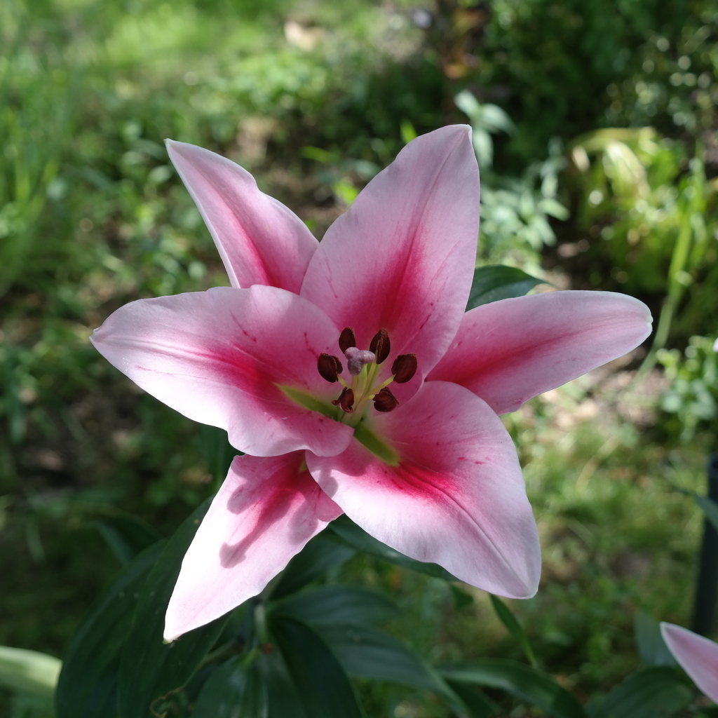 Abstammung:pardalinum × unknownBeschreibung:Inside of tepals predominantly orange-red, with large, irregular, golden yellow patch in basal one-third to half; midveins furrowed on inner tepals. Outside of tepals dusky pink; midribs sometimes red-purple. Spots numerous, mahogany, tiny to small circles, in coalescing yellow haloes; stigma dark purple. Tepals touching or slightly overlapping at base, margins smooth, tips recurved; pedicels mid-green. Stems 1 m or more, green. Early (June) External images: NALS QB 70, 3 (Sep 2016): centrefoldBezug:Salzborn: 2016,2017; Strasser: 2019; Wistuba: 2016,2017,2018,2019,2020,2021,2022; ELG: 2018,2021;
