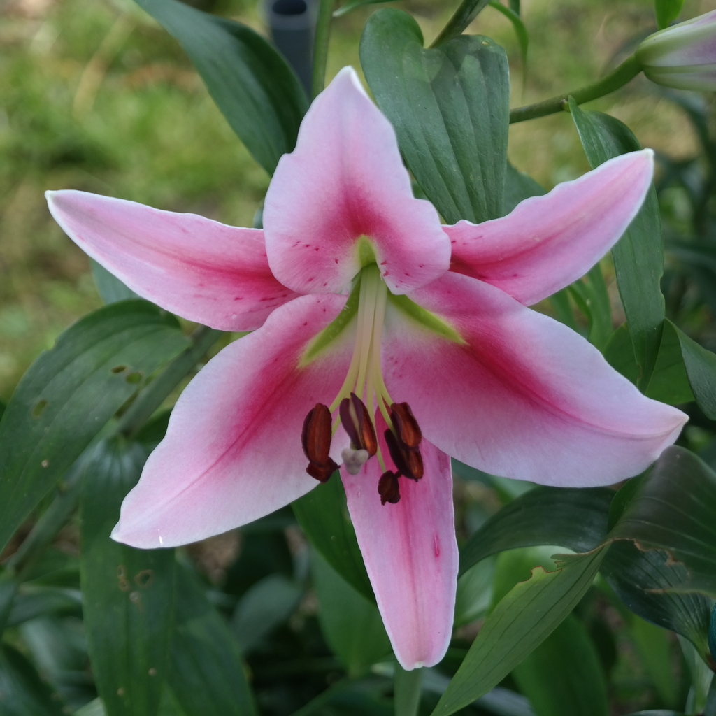 Abstammung:Pink Perfection Group x Glockenspiel Beschreibung:Inside of tepals moderate purplish pink (78D), bright golden yellow beside midveins in basal third; becoming paler with age, though margins remaining dark; midveins green in basal third; throat light greenish yellow (1C). Outside of tepals light purple (80C). Spots and papillae absent; filaments greenish white; pollen deep orange-yellow (163A); style reddish pink; stigma dark red (183B). Buds reddish pink. Fls 110mm wide, slightly scented; tepals 130 × 55mm, margins smooth, tips becoming strongly recurved; pedicels long, slender, pinkish red at first. Lvs scattered, 130 × 10mm. Stems 1.8m, moderate olive-green (147A), slightly spotted purple, with up to 12 fls. Late July. Fls unscathed by late frosts. Published in Europäische Liliengesellschaft Lilien-Info No.2: 20 (2002); picture p.21. Named "Frosty" from its resistance to late frosts; "PP" refers to its Pink Perfection parentage.Züchter:Dr. Jörg M. Giffei