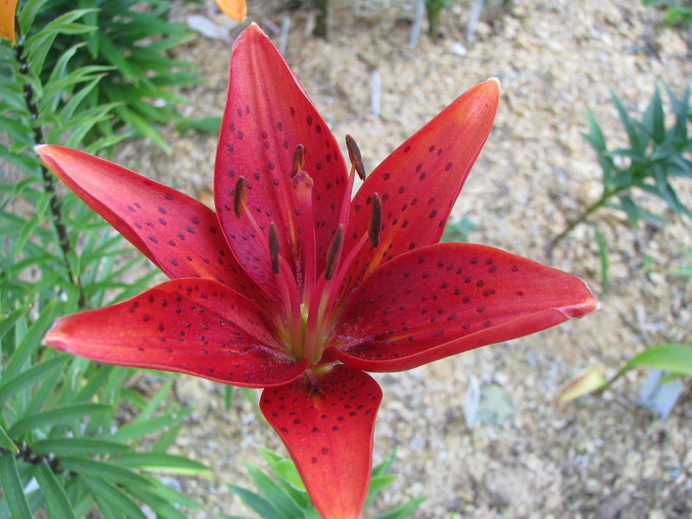 Abstammung:Un-named Blood Tiger seedling × Pirate Beschreibung:Tepals strong red (inside 46A, outside 53B); throat strong reddish orange (34C). Feint, vivid orange (28B) brushmark; spots mostly large, round or elliptical, dark red (187A), scattered in band in basal one third of each tepal above throat and across brushmark; papillae absent; nectaries 187A, frosted silver; pollen vivid red (44A); stigma dark purple. Fls 150mm wide, star- shaped, not scented; tepals 100 × 30mm, margins smooth, tips straight or (very) slightly recurved. Lvs 110 × 10mm, scattered, dark green (135A). Stems 0.9m, dark green, with up to 14 fls in racemose infl. July. The Havel is a river in Berlin; "stern" means "star" in German.Züchter:Dr. Jörg M. GiffeiBezug:Salzborn: 2005;