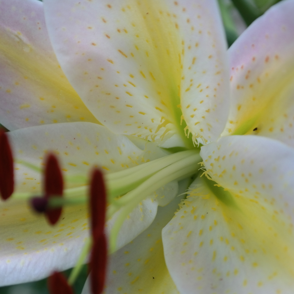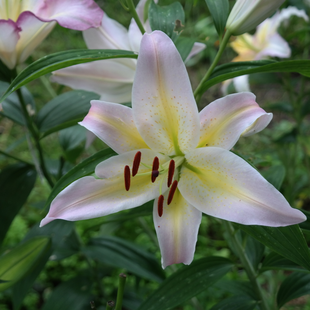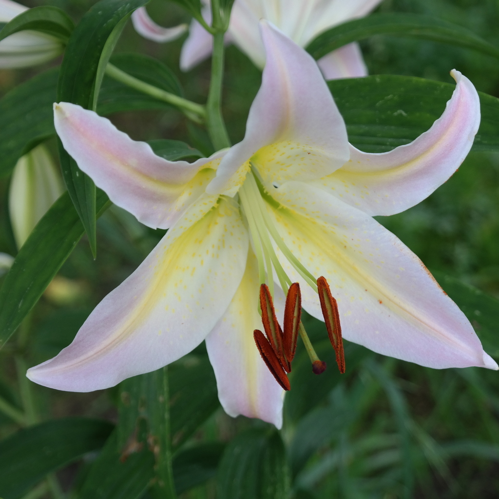 Abstammung:Johanna x asiatic seedlingBeschreibung:Greyed white (156A) throughout except for greenish white (157A) tips and a few, small, deep purplish red (71A) spots on basal half of each petal; nectaries greyish yellow-green (194A); pollen strong brown (172A); stigma dark purple (79A). Fls star-shaped, l20mm wide; petals 55 x 25mm, not ruffled, not recurved. Lvs alternate, 70 x 16mm. Stems 0.95m, dark green to black, with c10 fls. Late June.