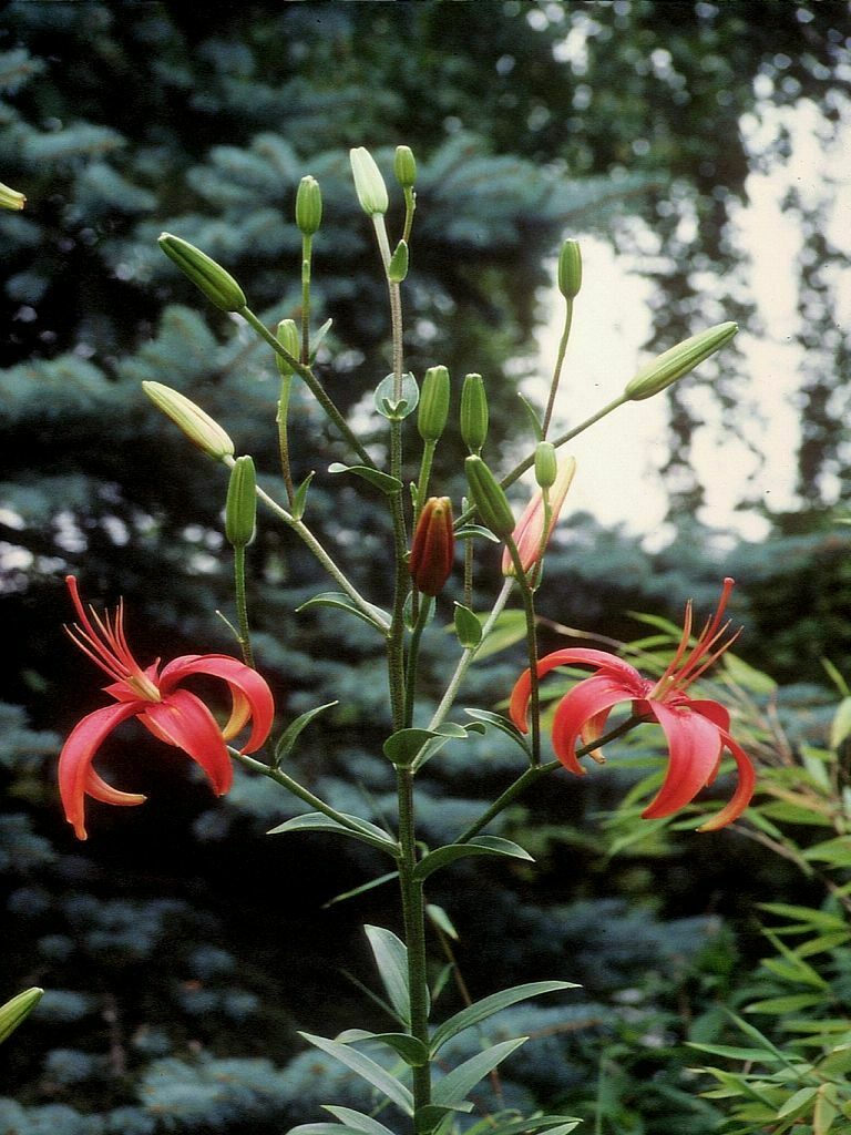 Abstammung:Unknown, "Connecticut complex" seedling x unknown, "Connecticut complex" seedlingBeschreibung:Inside of tepals moderate red (181A), shading to strong orange (168A) at tips; throat dark red (59A). Outside of tepals strong (greyed) orange. Spots absent; papillae dark red-purple; nectaries vivid yellow (14B); filaments orange over whitish ground; pollen strong orange (169C); style and stigma strong orange-yellow (163B). Fls 110mm wide, slightly scented; tepals 80 × 25mm, margins smooth, tips strongly recurved; pedicels tinged pale purplish brown at first, maturing green; with secondary and tertiary buds. Lvs scattered, 110 × 15mm, moderate olive-green (137A). Stems 1m, dark green with brownish spots, with up to 15 fls or more. July to August. Published in Europäische Liliengesellschaft sales list (1988) Named - because of its "Indian Red" colour - after the Apache chief Winnetou, fictional hero of several novels written by Karl May (1842-1912).Züchter:Dr. Jörg M. Giffei
