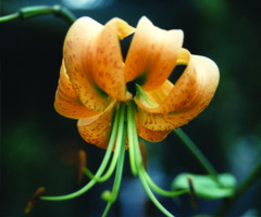 Abstammung:Henrietina x White Henryi Beschreibung:Inside moderate orange (167A) shading to pale orange-yellow (165D) at apex, throat moderate orange (167A); outside pale orange-yellow (165D); numerous, moderate sized, pale red spots over 3/4 of each petal and large papillae on basal part of each petal, coloured as the petal; nectaries deep yellowish green (141A); pollen dark reddish orange (175B) on long pale yellow-green (157C) filaments; stigma moderate reddish brown (176B) on a long style. Fls 95mm wide; petals 70 x 24mm, not ruffled, strongly recurved. Lvs alternate, unusually long, 250 x 30mm. Stems 2.0m, dark green with dark markings and c25 fls in a large inflorescence (50- 60cm long); the long pedicels often two-flowered. Mid to late July. (Standard: colour print provided by registrant (WSY 0032254).)