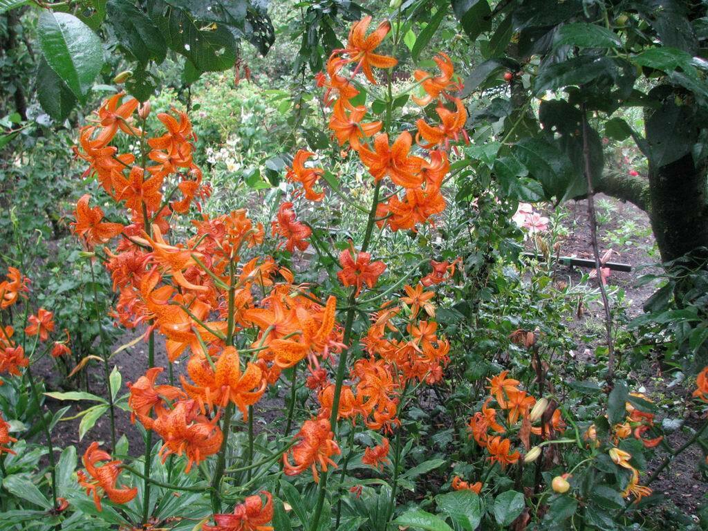 Abstammung:L. × dalhansonii Paisley Group X ((tsingtauense & martagon var. cattaniae) × tsingtauense)Beschreibung:Fl. colour varying from yellow, golden and apricot shades to wine-red; spots dark red and brown, on edges of up to two-thirds of each tepal; pollen dark apricot to orange. Fls c.30 × 70 mm, pendant or semi-pendant; tepals slightly to moderately recurved, very thick and shiny. Lvs whorled, c.130 × 45 mm. Stems 1-1.4 m, violet-dotted. Late June to July.
