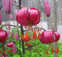 Abstammung:UnknownBeschreibung:Inside strong purplish red (60B), each petal lighter in centre, throat light green-red; outside strong purplish red (60B); pollen dark orange; stigma dark cherry-red. Fls 45 mm wide; petals 40 x 18 mm, margins smooth, tips strongly recurved. Lvs whorled, 150 x 40 mm. Stems 1.4 m, green, darker towards top, with c.25 fls; buds hairy. Late June. (Etymology: Kiara is a Latvian female name.)