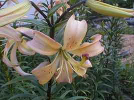 Farbänderung von muschelrosa nach hellgelb, pollenlos, nimmt aber Pollen asiatischer Hybriden und von Bill´s Special an