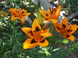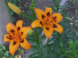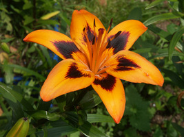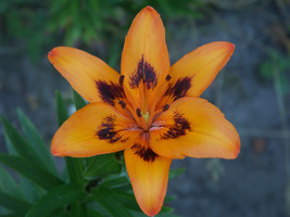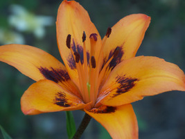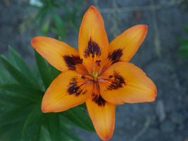 Abstammung:UnknownBeschreibung:Inside strong orange (25A/B) shading to 25A at edges, with a small flame of dark red (187A) extending from 1/4 to 1/2 way up each petal, throat vivid orange (28B); outside vivid orange (28B), outer petals tipped dark red (187A); stigma dark red (187B); paler at base; pollen moderate reddish brown (175A). Fls 170mm wide; petals 90 x 50mm. Lvs alternate, 110 x 10mm, mid green. Stems 0.6m, green, with much darker markings and c4 fls.Bezug:Salzborn: 1999,2001,2003,2005,2007,2008,2010; Strasser: 2010,2015,2019;