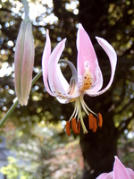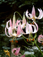 Abstammung:Peachwood seedling derived from open-pollinated × dalhansonii Paisley GroupBeschreibung:Inside of tepals strong purplish pink (63C)in upper half; basal half predominantly white as defined by distribution of spots, each being enclosed by a broad margin of white, these margins coalescing with a flare of warm, yellowish orange along and beside midveins; throat yellowish white (155D). Outside of tepals light purplish pink (62C). Spots mostly small to medium-sized, roundish, dark purple (79B), mainly along margins and over flare in basal half of each tepal, sometimes coalescing to form larger spots over flare; papillae absent; nectaries brilliant yellow (13C); filaments whitish; pollen moderate reddish brown (166B); style pale green; stigma greyed orange. Buds soft, greyish pink. Fls 70mm wide, not scented; tepals 75 × 17mm, margins smooth, tips strongly recurved; pedicels very long and slender, pale green, tinged greyed mauve towards base of fl. Lvs whorled or scattered, 170 × 20mm. Stems 1.8m, moderate olive-green (137B), with up to 20 fls. July. Published in Europäische Liliengesellschaft Lilien-Info No.1, (2004) External images: Steinbrück (2006): 123 A female first name in Germany.Züchter:Dr. Jörg M. Giffei