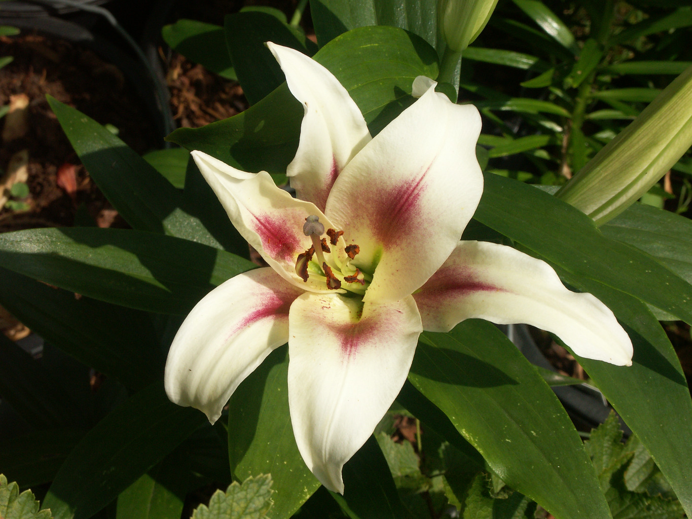 Abstammung:Unnamed asiatic seedling x unnamed seedlingBeschreibung:Inside white (155D), throat tinged yellow; outside white (155D); without markings; nectaries brilliant green (129B); pollen vivid reddish orange (34B); stigma grey-green. Fls 140mm wide; petals 70 x 30mm, not ruffled, tips slightly recurved. Lvs alternate, 80 x 10mm, mid green. Stems 0.8m, pale green, with c.8 fls. Late June-early July. Syn. Schneeflocke Bezug:Salzborn: 1998,1999,2000,2001,2002,2003,2004,2005;