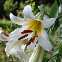 Abstammung:White-flowered tetraploid trumpet lily x deep yellow-flowered tetraploid trumpet lilyBeschreibung:Inside creamy white, throat apricot-yellow with deep yellow rays; outside with yellow shining through, midribs green with a few red-brown spots; spots absent; pollen apricot- brown; stigma greyish. Fls 160 mm wide; tepals 150 x 52 mm, slightly twisted, margins slightly wavy, tips somewhat recurved; pedicels 80 mm, very thick, brown-dotted, with secondary buds. Lvs scattered, 105 x 12 mm, dull dark green. Stems 1.25 m, dotted with red-brown. Early July. Tetraploid.Bezug:Salzborn: 2005; Wistuba: 2015;