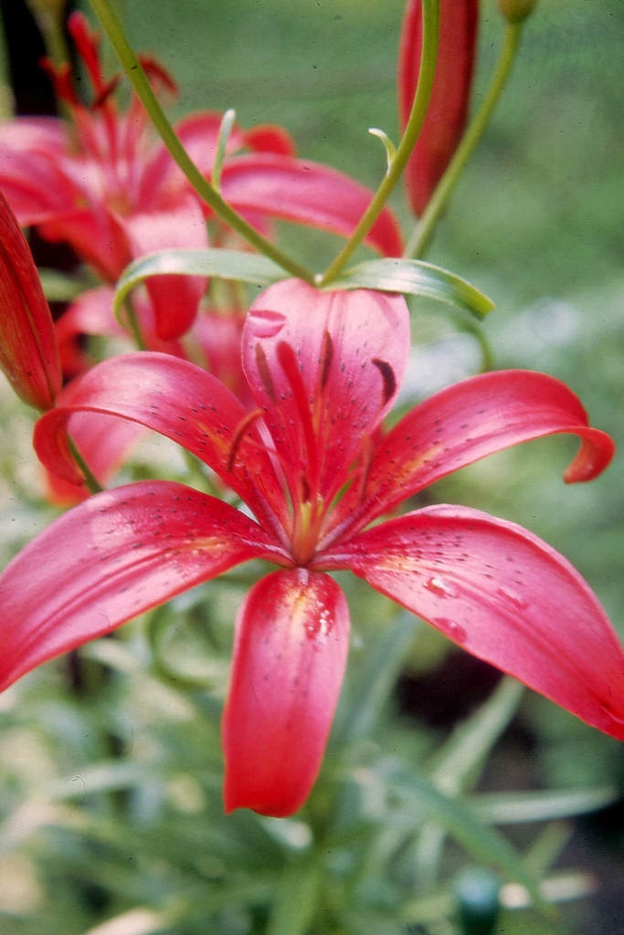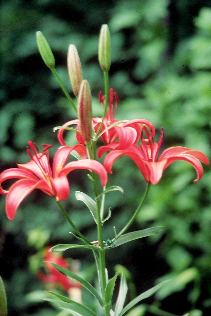 Abstammung:Probably L. leichtlinii var. maximowiczii x L. x hollandicum; raised from seed from R.WarnerBeschreibung:Red 46A, with orange-red dash near nectary and with elongated brown spots; pollen dark red; petals narrow, slightly recurved. Lvs dark green. Stems 1.0-1.4m. July.Bezug:Salzborn: 1996;