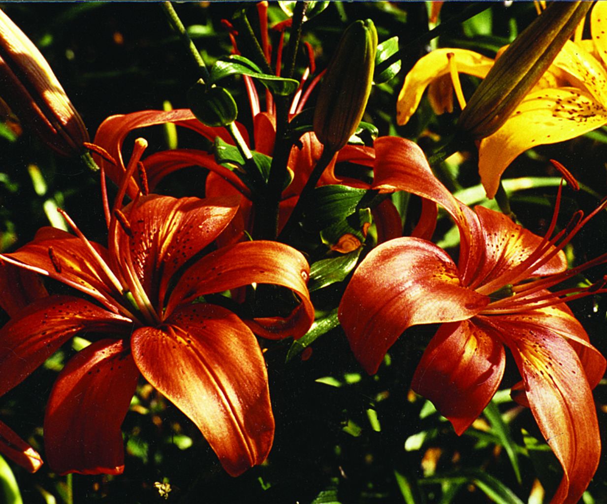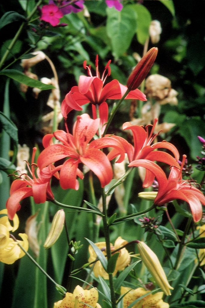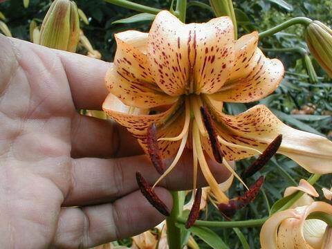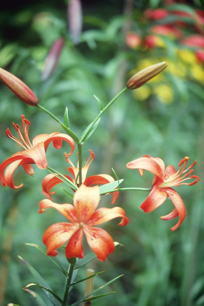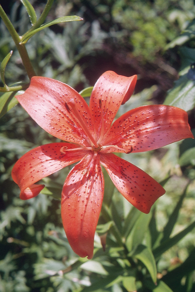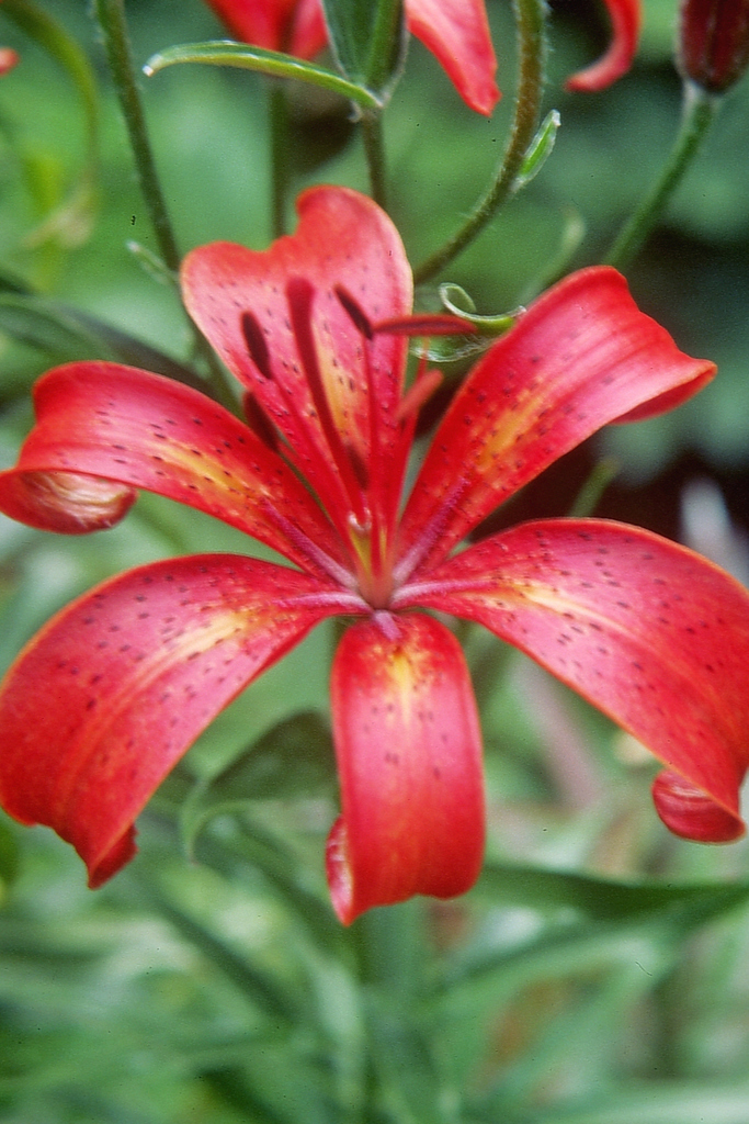 Abstammung:Complex L. davidii x L. x maculatumBeschreibung:Orange-Red 35A, small brown spots on inner 1/2; pollen orange-red; petals narrow, slightly recurved. Lvs dark green. Stems up to 1.5m. July.Bezug:Salzborn: 1994;