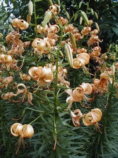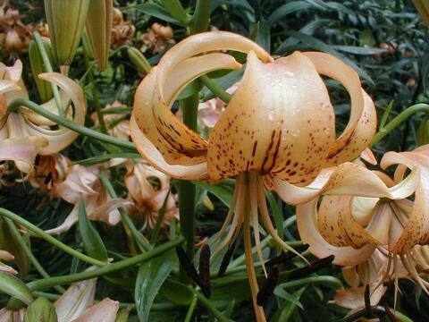 Abstammung:(L. lankongense x Maxwill ) x Enchantment Beschreibung:Orange ochre inside, orange outside; few dark ochre spots; nectaries orange. Petals 74 x 29mm; not ruffled, strongly recurved. Lvs alternate, 120 x 1mm, midgreen. Stems0.9-1.0m, with 12 or more, slightly scented fls. Late-midseason. An allotriploid.Bezug:Salzborn: 1994;