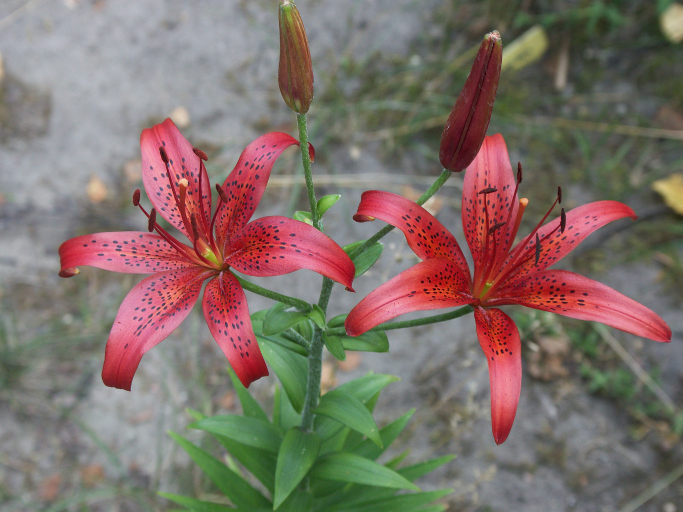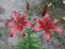 Abstammung:Seed from open-pollinated Redstart Beschreibung:Red 46A, tips Red 47A, throat Yellow-Orange 21A, outside Red 48D and darker towards margins; numerous large Black (202A) spots; nectaries frosty white; pollen Greyed-Orange 169A. Petals c 100 x 30mm, not ruffled, tips slightly recurved. Fls 150mm wide. Lvs alternate, 132 x 16mm, dark green. Stems 0.75m, hairy, dark purple. Late July.Bezug:Salzborn: 1996,1997,1998,1999,2003,2005;