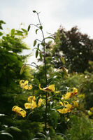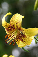 Abstammung:Tempeltanz × Tango Max Beschreibung:Tepals brilliant yellow, inside (including throat) 7B, outside 10A. Spots numerous, in two forms – as tiny dark red (187B) circles and short streaks widely spread across much of basal two-thirds of each tepal (except for upper, mid blade) and often coalescing Tango-style into reasonably dense blotches near base, but also as large and darker ellipses in brushmark-like pattern in basal half; papillae few, pale green; nectaries closed, with ridges light yellow (160B), frosted; filaments pale yellow; pollen strong orange (169C); stigma dark red (187B). Fls 110 mm wide, not scented; tepals 80 × 40 mm, margins slightly ruffled, tips recurved to strongly recurved; secondary buds present. Lvs 140 × 20 mm, scattered, moderate olive-green (137A). Stems 1.7 m, dark green, with up to 20 fls in open, pyramidal infl. July. Published in European Lily Society [ELG]’s Lilien-Info (2012) Epithet means "temple tower" in GermanZüchter:Dr. Jörg M. Giffei