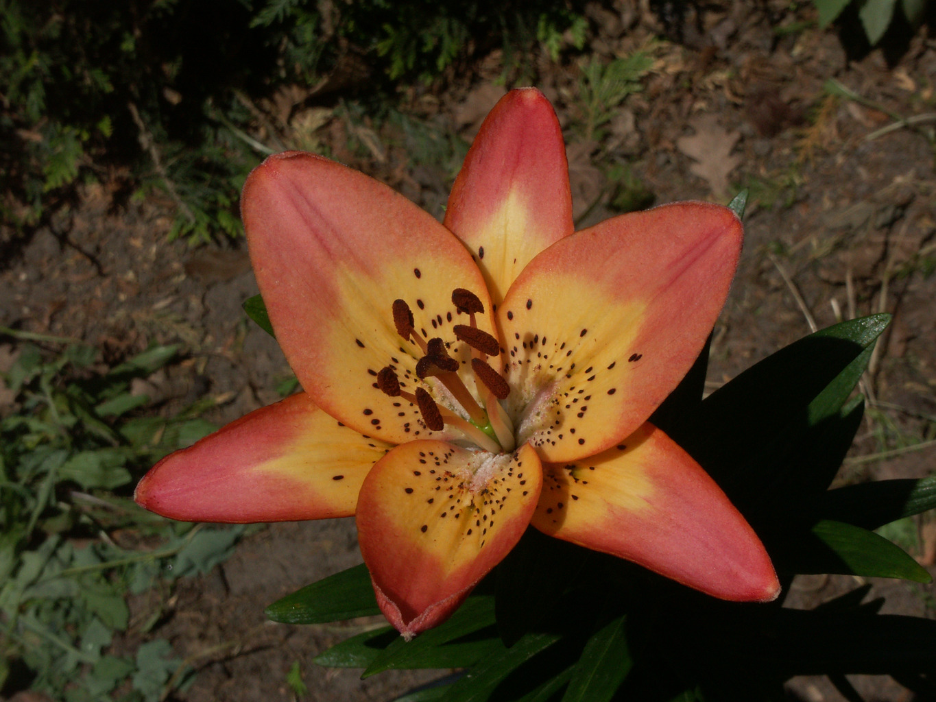 Abstammung:(Cream-flowered tetraploid X (Gran Paradiso x Tetra Aristo ))Beschreibung:Inside pale old rose, centre of each petal cream with apricot tint, throat cream; spots numerous, large, dark brown-rose over half of each petal; nectaries white-granulated; pollen orange-brown. Fls 145 mm wide; petals 85 x 42 mm, margins smooth, tips not recurved.; pedicels 55 mm long, very thick, slightly spotted. Lvs alternate, 130 x 20 mm, dark dull green. Stems 0.9 m, very thick, slightly spotted, with a short inflorescence. Mid June. Tetraploid.Bezug:Salzborn: 2006,2007,2010,2011;
