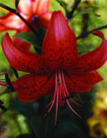 Abstammung:Redbird hybrid x mixed pollenBeschreibung:Strong reddish orange (42B), tips and throat strong reddish orange (42C), outside deep yellowish pink (41D); with many, medium-sized spots of dark red-deep purplish red (187B-D) on 2/3 of each petal; nectaries red, white frosted; pollen moderate reddish orange (171A). Fls 120mm wide; petals 81 x 34mm, not ruffled, tips slightly or not recurved. Lvs alternate, 82 x 12mm, mid green. Stems 1.1m, greyed purple, with c10 fls and stem bulbils. Mid July.Bezug:Salzborn: 1994,1996,1997,1998,1999,2000,2001,2002,2003,2004,2005,2006,2007; Strasser: 2010;