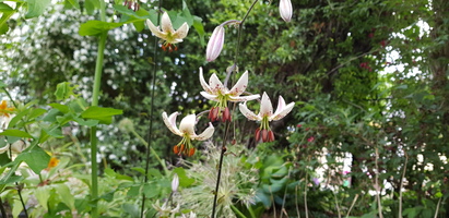 Abstammung:Paisley Hybrid x unknownBeschreibung:White, with pale beige shading and a golden tint above the nectaries, outside white with lightly spotted edges and pink midribs; dense, medium-sized, pink spots over 4/5 of each petal; pollen brown; nectaries yellowish green; stigma dark carmine brown. Fls 52mm wide, semi-globular; petals 35 x 13mm, slightly to moderately recurved; pedicels 25mm long, violet brown. Lvs whorled, 80 x 30mm, yellowish green, dull. Stems 1.05m, dotted with violet brown, green at base, with a longish inflorescence. Mid June. Revised description: that published in The International Lily Register Twelfth Supplement, p.32 (1994) had been supplied in error by the registrant.Bezug:Salzborn: 1996,1998,2004,2005,2007,2009,2016;