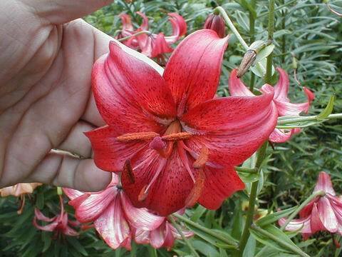 Abstammung:(L. lankongense x Edith Cecilia ) x ((L. tigrinum var. flaviflorum x Destiny ) x Red Fortune )Beschreibung:Dark red throughout with some darker red spots; nectaries dark red; pollen brown. Petals not ruffled, strongly recurved. Lvs alternate, 110 x 8mm, dark green. Stems 0.65-1.0m, with 5-7, slightly scented fls. Midseason. An allotriploid.Bezug:Salzborn: 2009,2010;