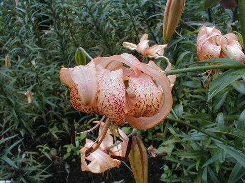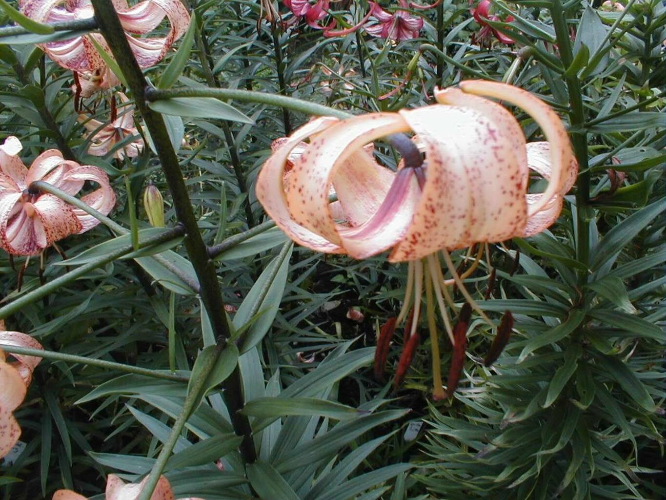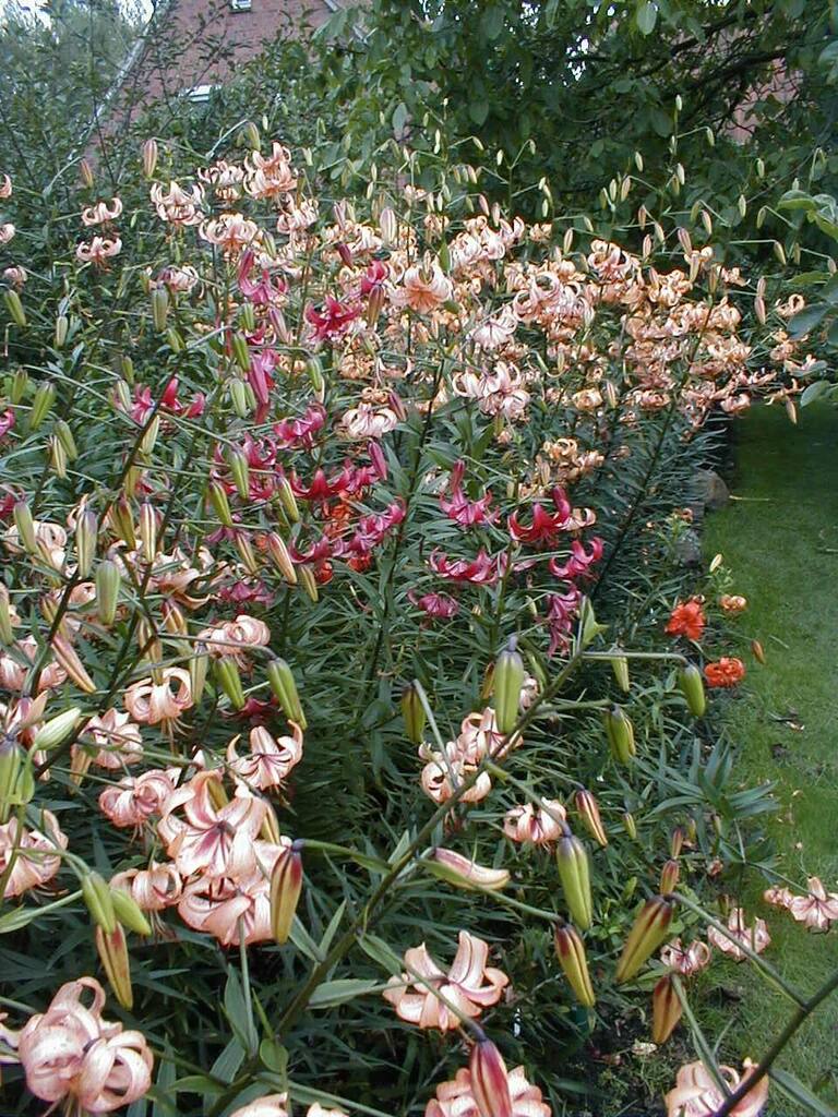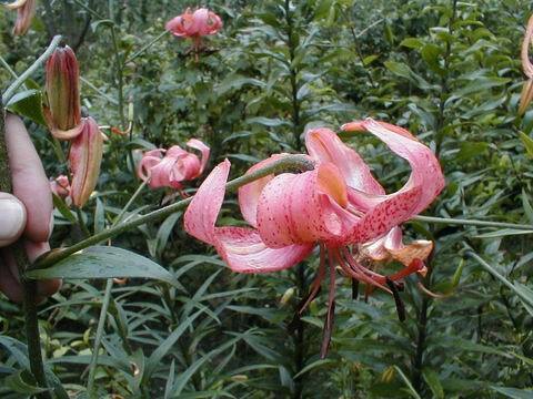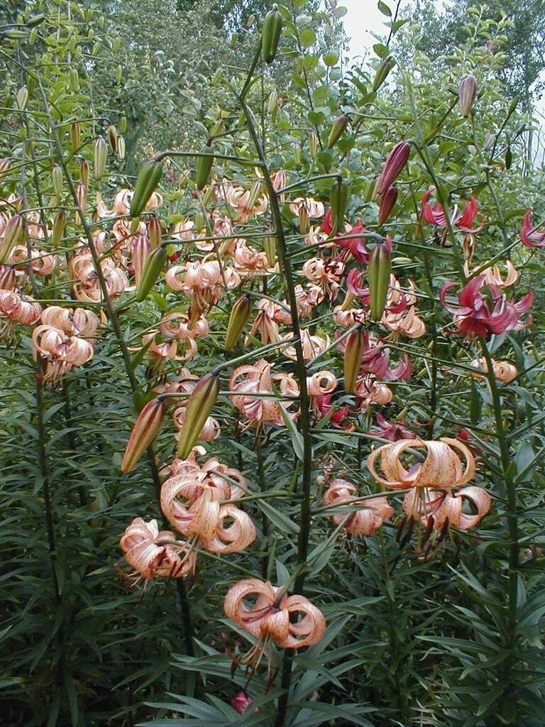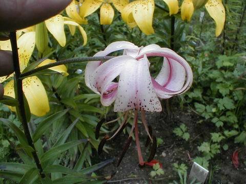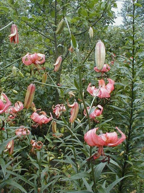 Abstammung:(L. lankongense x Maxwill ) x (Cardinal x (L. tigrinum var. flaviflorum x Enchantment ))Beschreibung:Pale mauve pink, deeper in throat, dark red on outside; dark red spots mainly towards centre of petal; nectaries reddish; pollen dark red. Fls 70mm wide; petals 76 x 24mm, not ruffled, strongly recurved. Lvs alternate, 94 x 10mm, dark green. Stems 0.7-0.75m, dark red, with 15 or more, slightly scented fls, occasionally with bulbils. Midseason. An allotriploid.