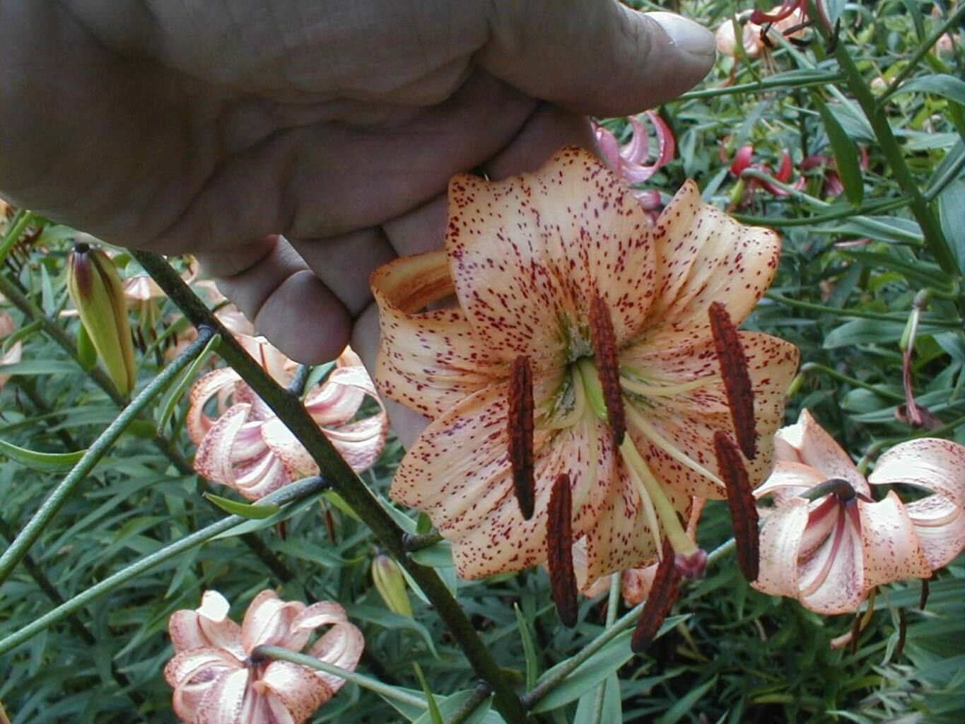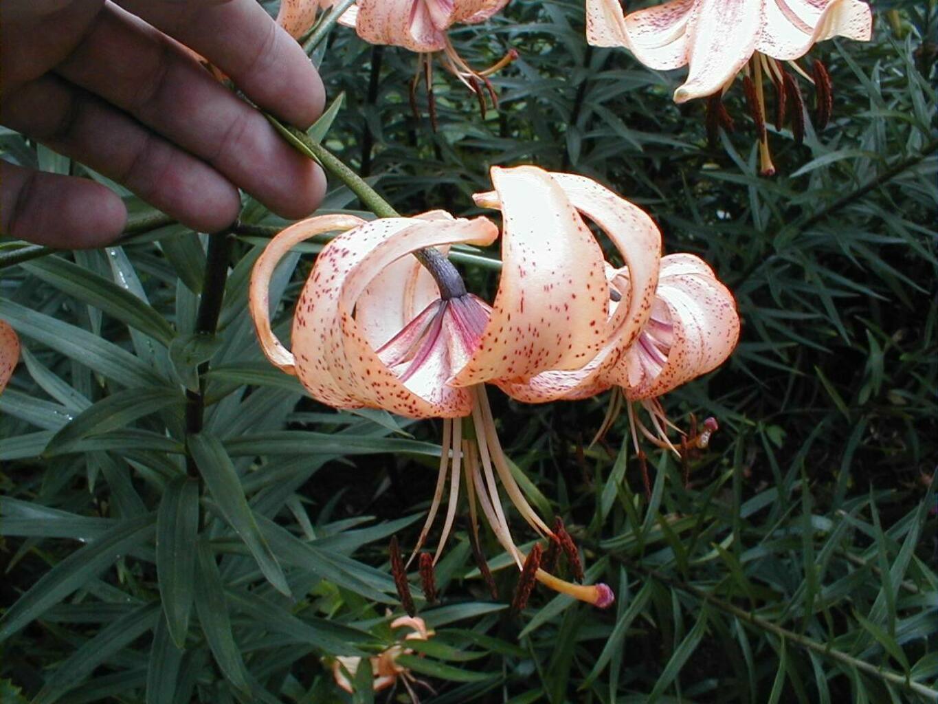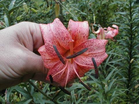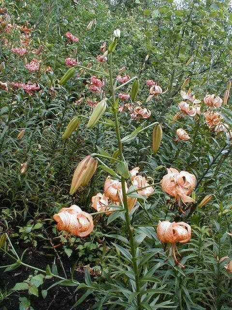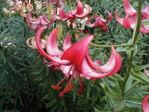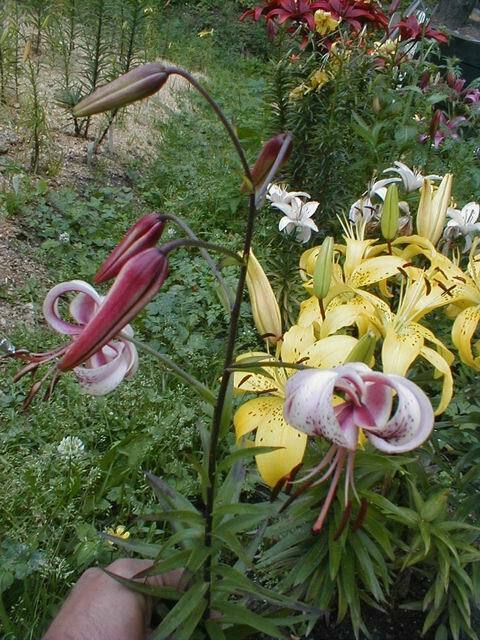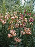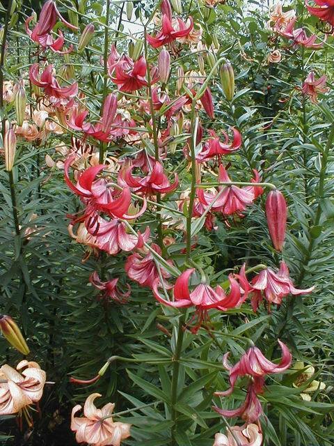 Abstammung:(L. lankongense x Maxwill ) x (Cardinal x (L. tigrinum var. flaviflorum x Enchantment ))Beschreibung:Pale mauve pink, deeper in throat, dark red on outside; dark red spots mainly towards centre of petal; nectaries reddish; pollen dark red. Fls 70mm wide; petals 76 x 24mm, not ruffled, strongly recurved. Lvs alternate, 94 x 10mm, dark green. Stems 0.7-0.75m, dark red, with 15 or more, slightly scented fls, occasionally with bulbils. Midseason. An allotriploid.