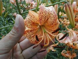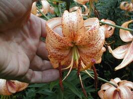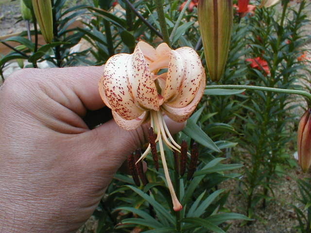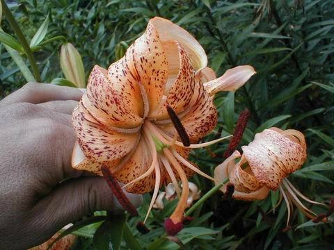 Abstammung:Thomas seedling 4 XTetra Aristo Beschreibung:Inside apricot-orange, darker around nectaries, base of throat paler; outside pale orange, midribs pale yellow-green; spots many, large, dark brown-crimson, over half of each petal, papillae in throat; nectaries white-granulated; pollen red-brown; stigma pink-brown. Fls 130 mm wide; petals 90 x 45 mm, margins slightly waved, tips scarcely recurved (the outer more so); pedicels 60 mm long, thick, profusely brown-dotted. Lvs alternate, 145 x 21 mm, dull dark green. Stems 0.85 m, very thick, profusely brown-dotted. Mid July.Bezug:Salzborn: 2008,2009,2011;