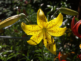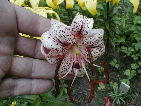 Abstammung:Probably L. tigrinum x L. x hollandicum hybridBeschreibung:Yellow 12B, shaded Yellow-Orange 21C in centre; spotted brown; pollen orange-yellow; petals hardly recurved. Lvs bright dark green. Stems 1.2m. Late July.Bezug:Salzborn: 1994,1996,1997,1998;