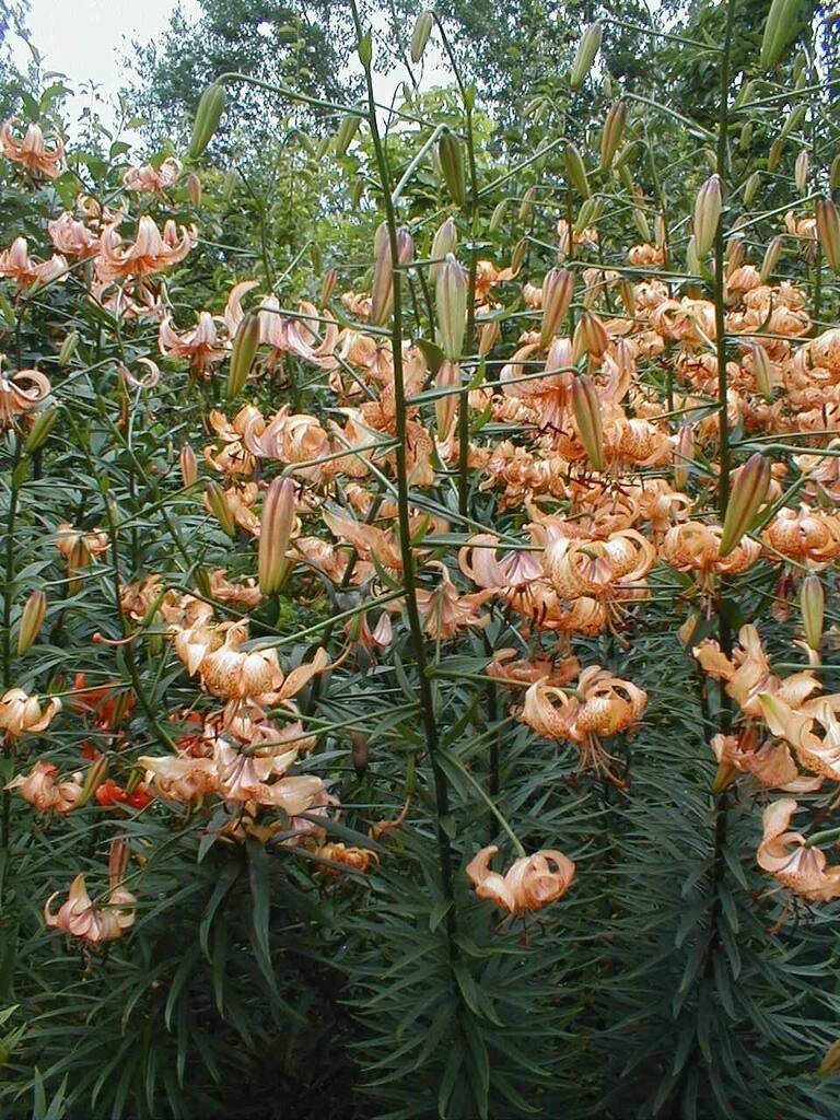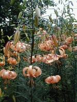 Abstammung:(L. lankongense x Maxwill ) x Enchantment Beschreibung:Orange ochre inside, orange outside; few dark ochre spots; nectaries orange. Petals 74 x 29mm; not ruffled, strongly recurved. Lvs alternate, 120 x 1mm, midgreen. Stems0.9-1.0m, with 12 or more, slightly scented fls. Late-midseason. An allotriploid.Bezug:Salzborn: 1994;