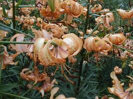 Abstammung:L. lankongense x unnamed asiatic hybridBeschreibung:Tips Yellow-Orange 23D, throat 23D to Orange 25D, margins and some papillae Orange 24A, outside 23D flushed ± Greyed-Orange 166B at base; copiously spotted Red 53A in lower 2/3; nectary Yellow-Green 144B; pollen Orange-Red 34A. Petals 70 x 19-27mm, not ruffled, strongly recurved. Fls 60-70mm wide. Lvs alternate, the upper 110 x 12mm, dark green. Stems c.1.6 m, green, flecked greenish brown, with 8-48 fls. July.Bezug:Salzborn: 1996,2009,2010,2013,2014,2015,2016; Mathys: 2011; Wistuba: 2014,2015,2016,2020;