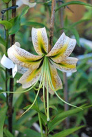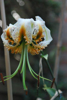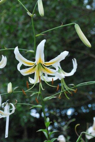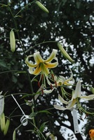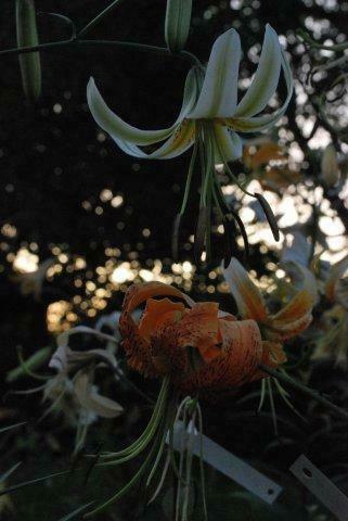 E8..58.1 blüht sehr spät und beendet mit den letzten aufgeblühten Zweitblüten das Lilienblütenjahr. Die offenen weißen Aurelianblüten hängen an langen dünnen Blütenstielen, so dass trotz der hohen Blütenzahl jede einzelne der kleinen Blüten gut zur Geltung kommt. Die Nektarien sind lackschwarz. In der Sämlingspopulation fiel mir die Pflanze sofort und lange vor der Blüte durch ihre vielen schmalen dunkelgrünen Laubblätter auf. Das gute Bild rundet sich dadurch ab, dass die Pflanze sehr standfest ist und sich allenfalls der voll aufgeblühte Blütenstand leicht zur Seite neigt. Die Pflanze bleibt bis zum ersten Frost grün.