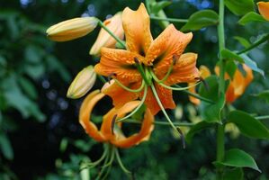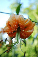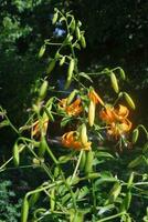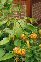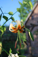 E8..50.1 blüht für eine Rosthornii-Nachkomme eher früh, allerdings knapp zu spät für die Lilienschauen. Als ich 2014 aus Eberswalde zurückkam, war sie gerade aufgeblüht. Wenn man von den schwarzen Nektarien absieht, ist die Pflanze ein klassischer Aurelian-Typ. Allerdings ist sie sehr standfest und neigt sich kaum zum Licht. Sie bringt immer Zweitblüten an einem langen Blütenstand und blüht deshalb sehr lange. Der Vater war Tanecnice, dessen rezessives Gelb hier nicht zur Ausprägung kommt. Das Orange der Blüten bleicht kaum aus und macht die Pflanze zu einem echten Blickfang.