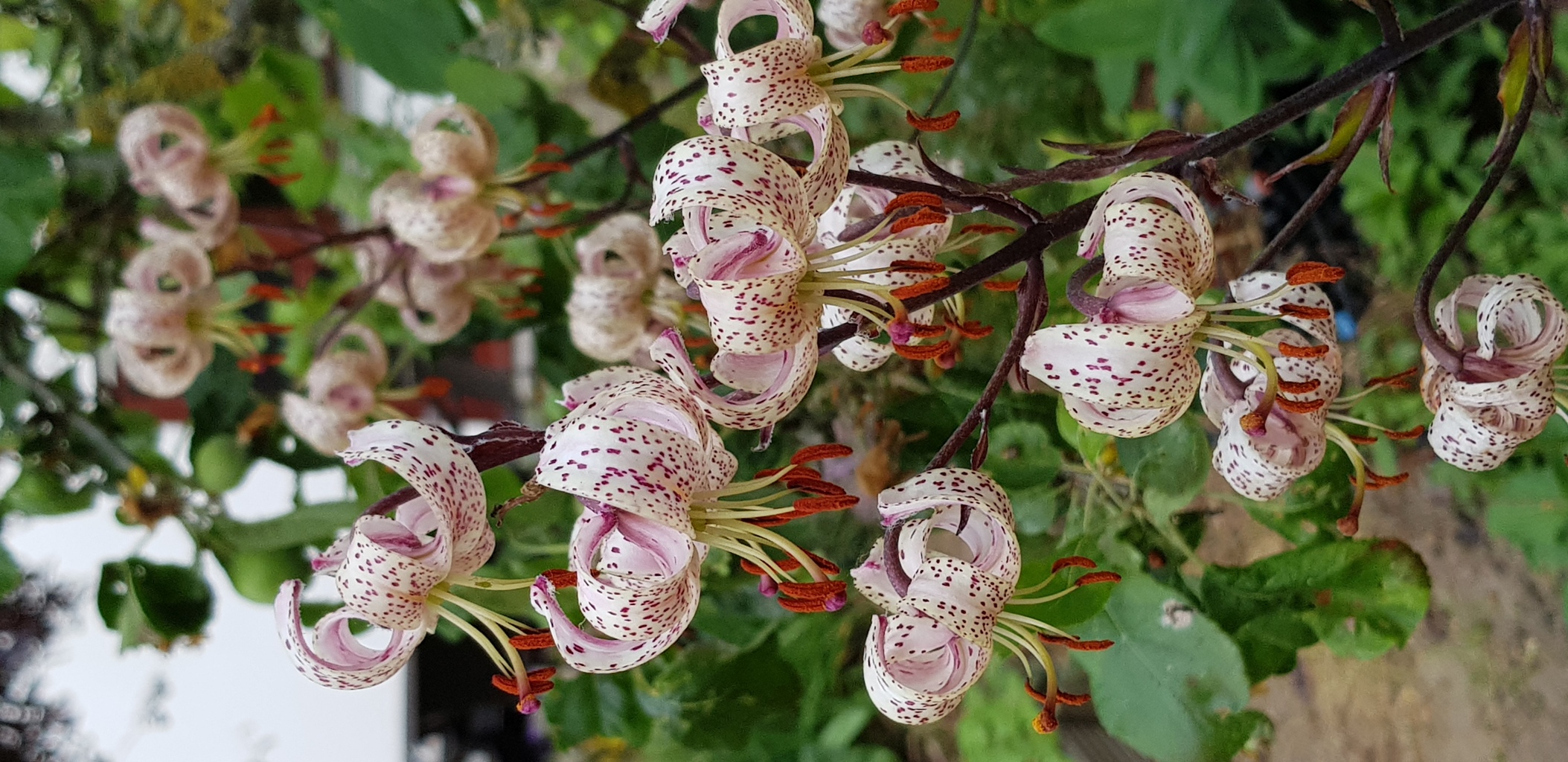 Abstammung:Blood Tiger seedlingBeschreibung:Orange-Red 34A throughout, with reddish and orange shading and large dark brown spots on 2/3 of petal; nectary orange; pollen reddish brown. Petals 90mm long, reflexed. Lvs bright green. Stems 1.2m, suffused brown, with axillary bulbils and up to 12 fls.Bezug:Salzborn: 1994,1996,1997;