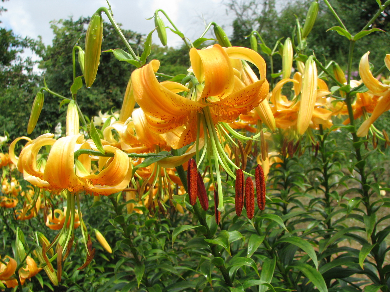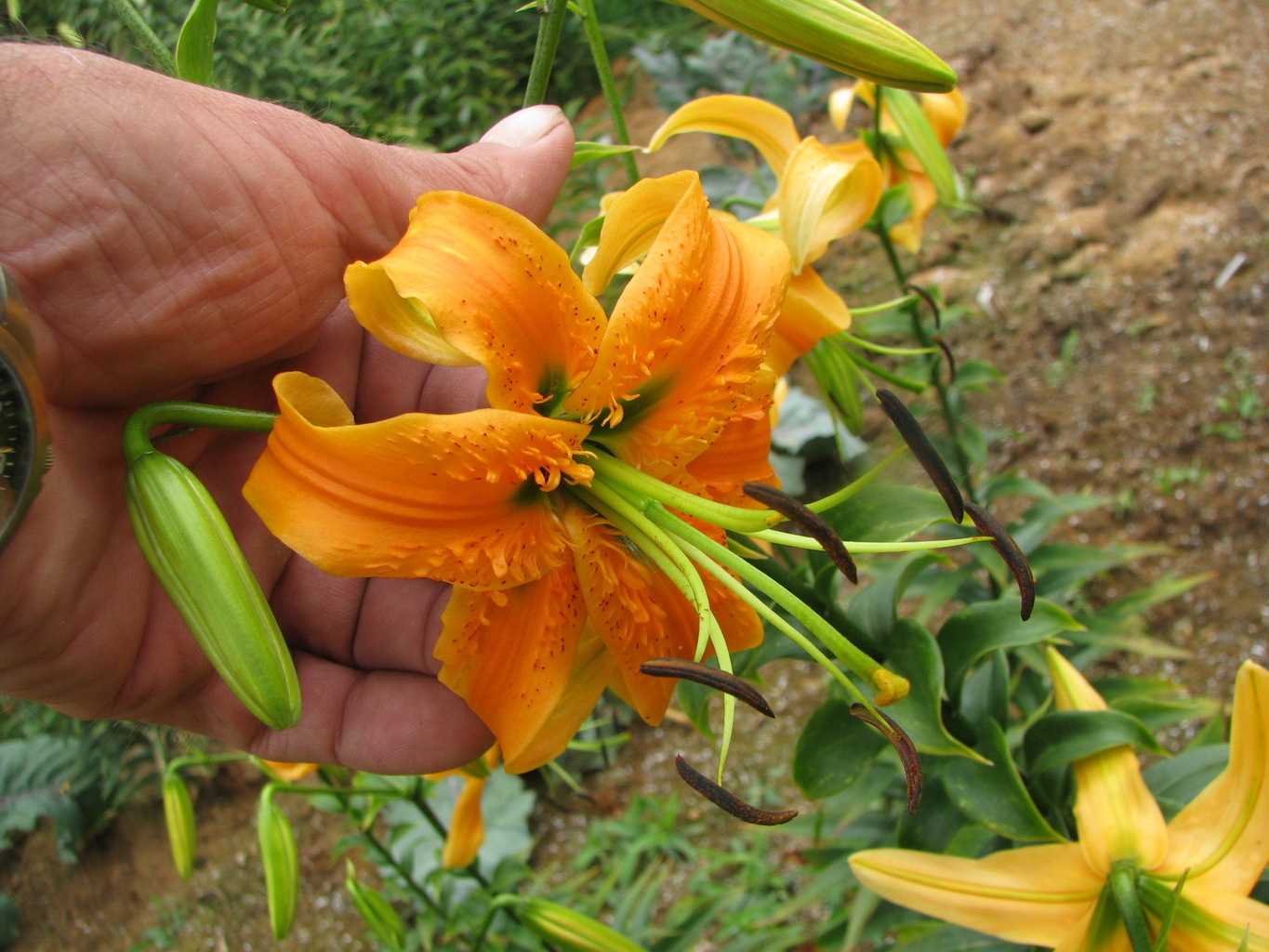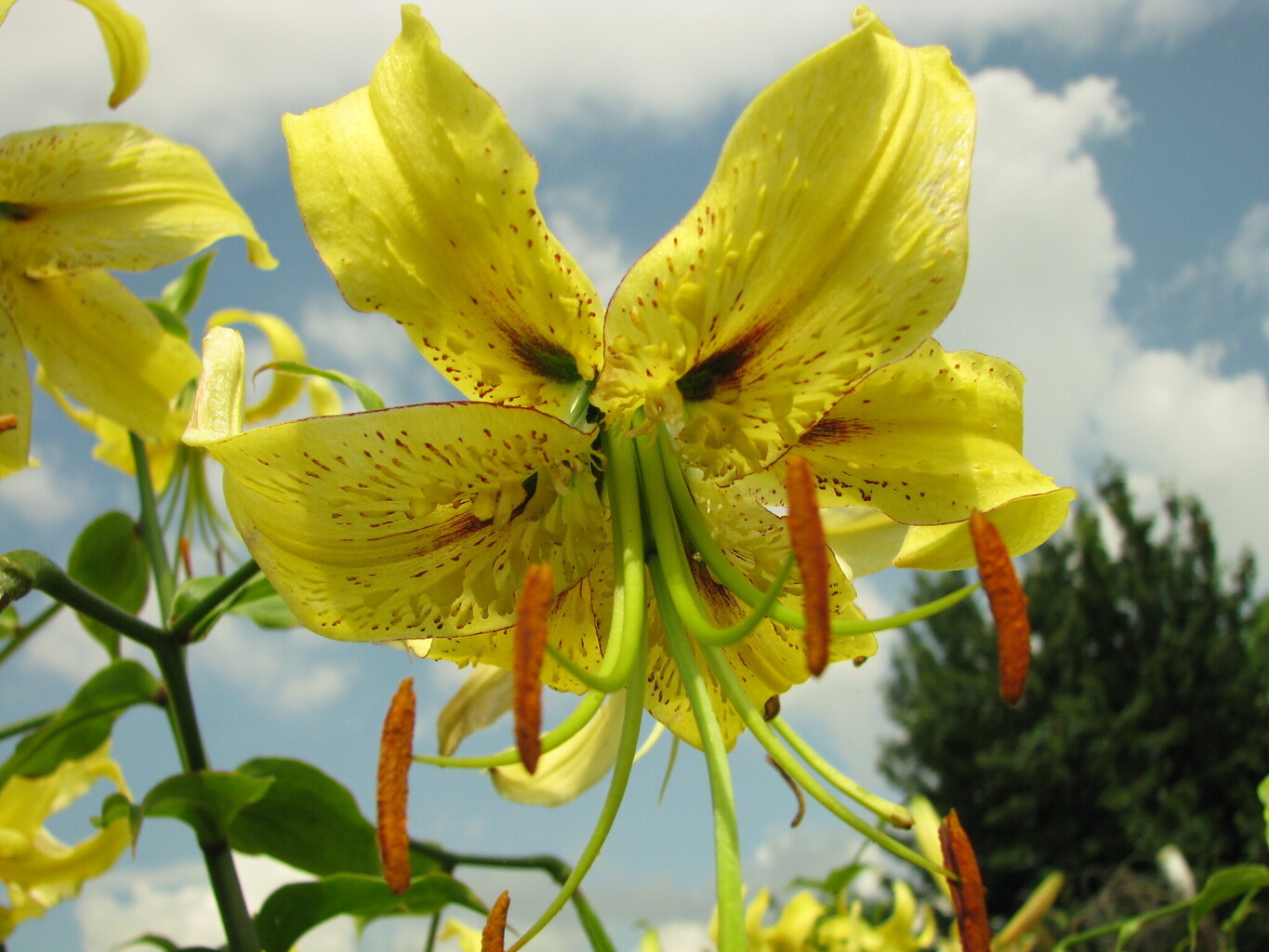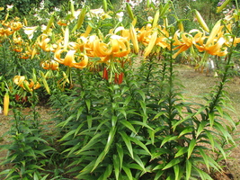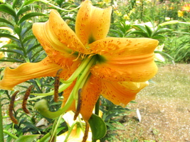 Abstammung:L. tigrinum hybridBeschreibung:Fls ochre yellow, with a brownish red centre, spotted. Petals not reflexed. Stems up to 1.5m. Late July.Bezug:Salzborn: 1994,1998,1999,2001,2003,2005;