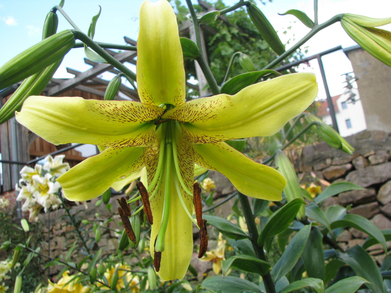 Abstammung:(Häuptling Winnetou × Sonnentiger ) x unnamed orange Tango hybridBeschreibung:Inside of tepals and throat vivid yellow (12A); outside of tepals greenish yellow. Spots numerous: large, elliptic ones dark red (187A), scattered densely and evenly over basal third of each tepal; small, round spots paler, more crimson, densely interspersed between larger spots and scattered more sparsely beyond over basal half of each tepal, particularly along margins and midveins; papillae and nectaries brilliant greenish yellow (1B); filaments golden yellow, tinged green towards top; pollen brownish orange (171B); style yellowish green; stigma dark red (187A). Buds greenish yellow. Fls 150mm wide, not scented; tepals 80 × 35mm, margins smooth, tips slightly recurved to recurved; pedicels 160mm, green. Lvs scattered, 140 × 23mm, moderate olive-green (147A). Stems 1.3m, 147A, with up to 12 fls in a spreading raceme. July. Published in Europäische Liliengesellschaft sales list (2010)Züchter:Dr. Jörg M. GiffeiBezug:Salzborn: 2010,2011,2012,2014,2015;