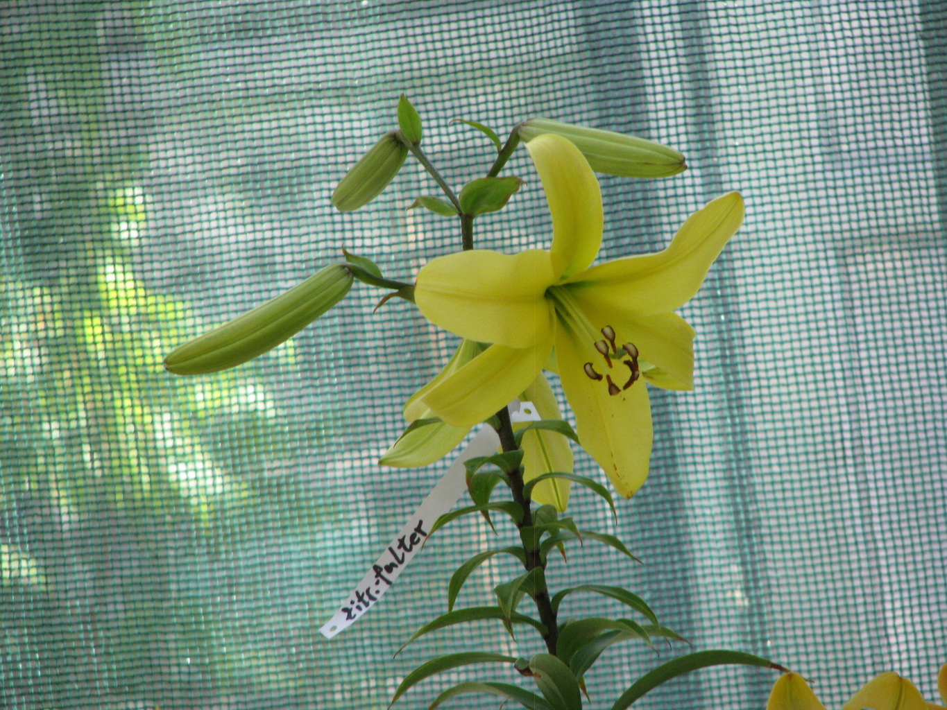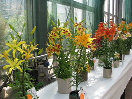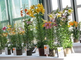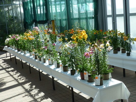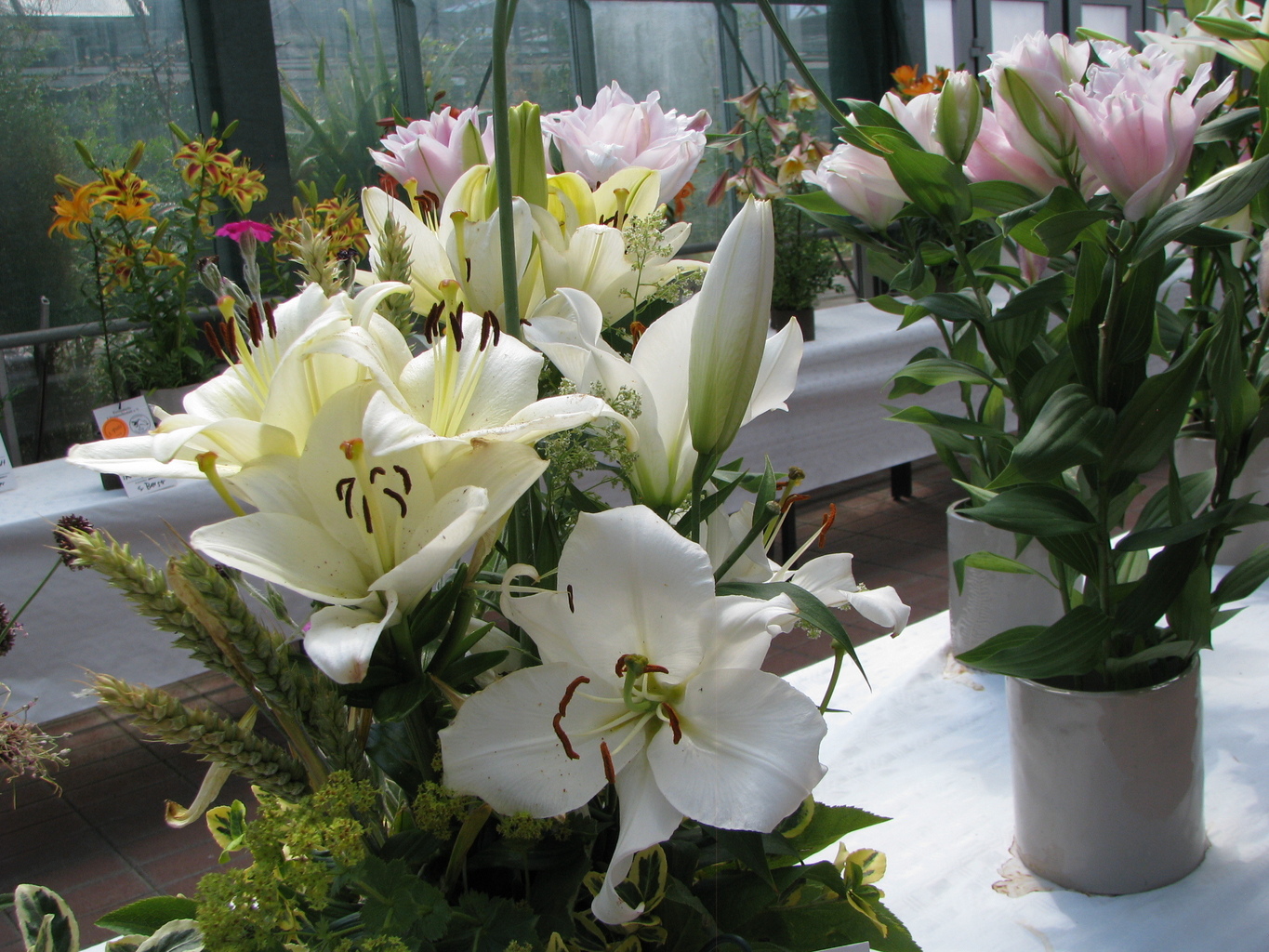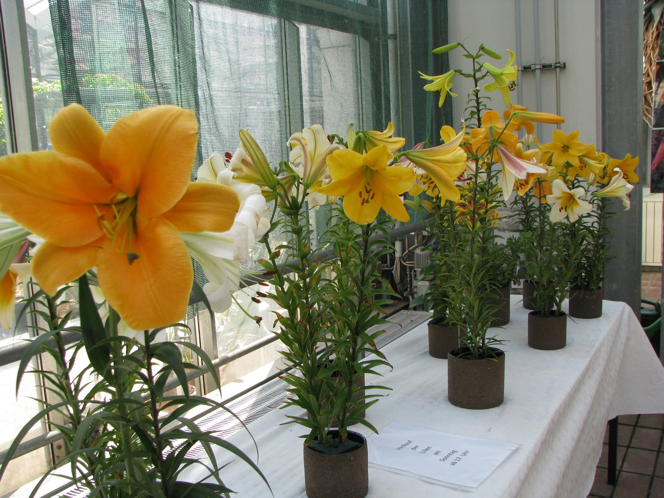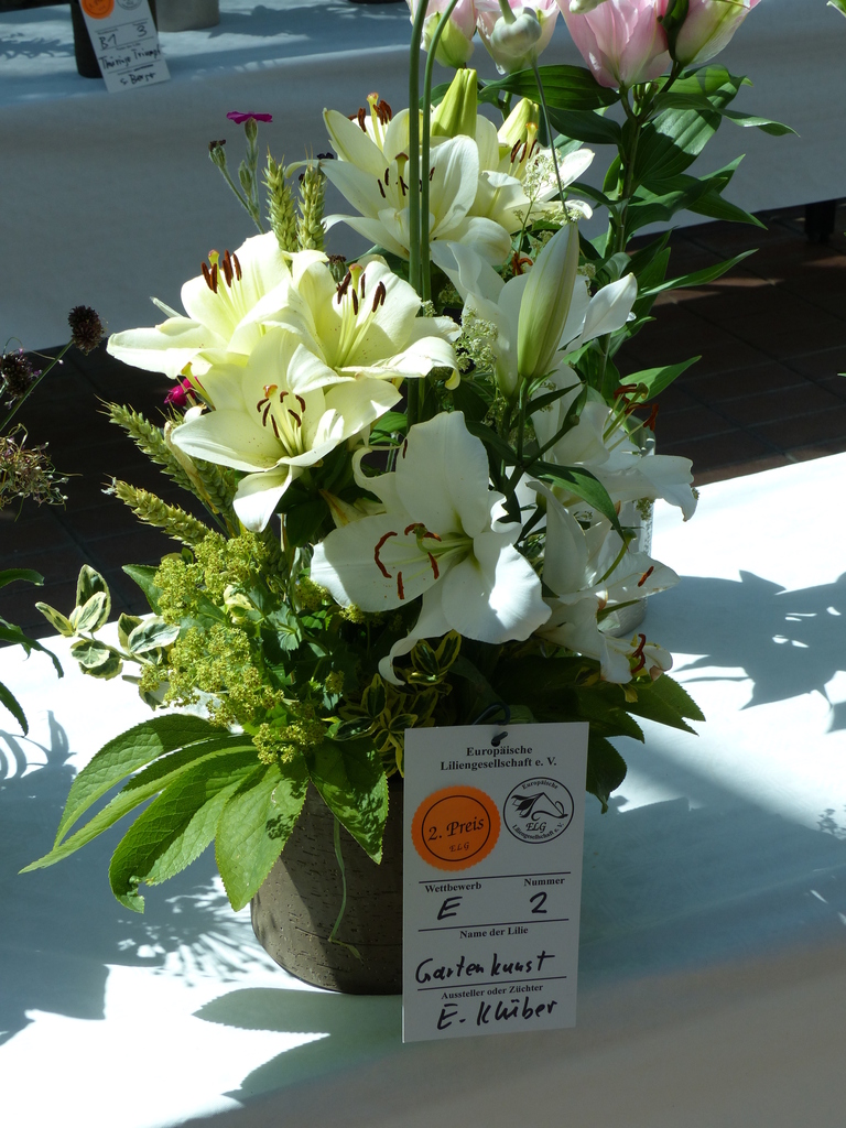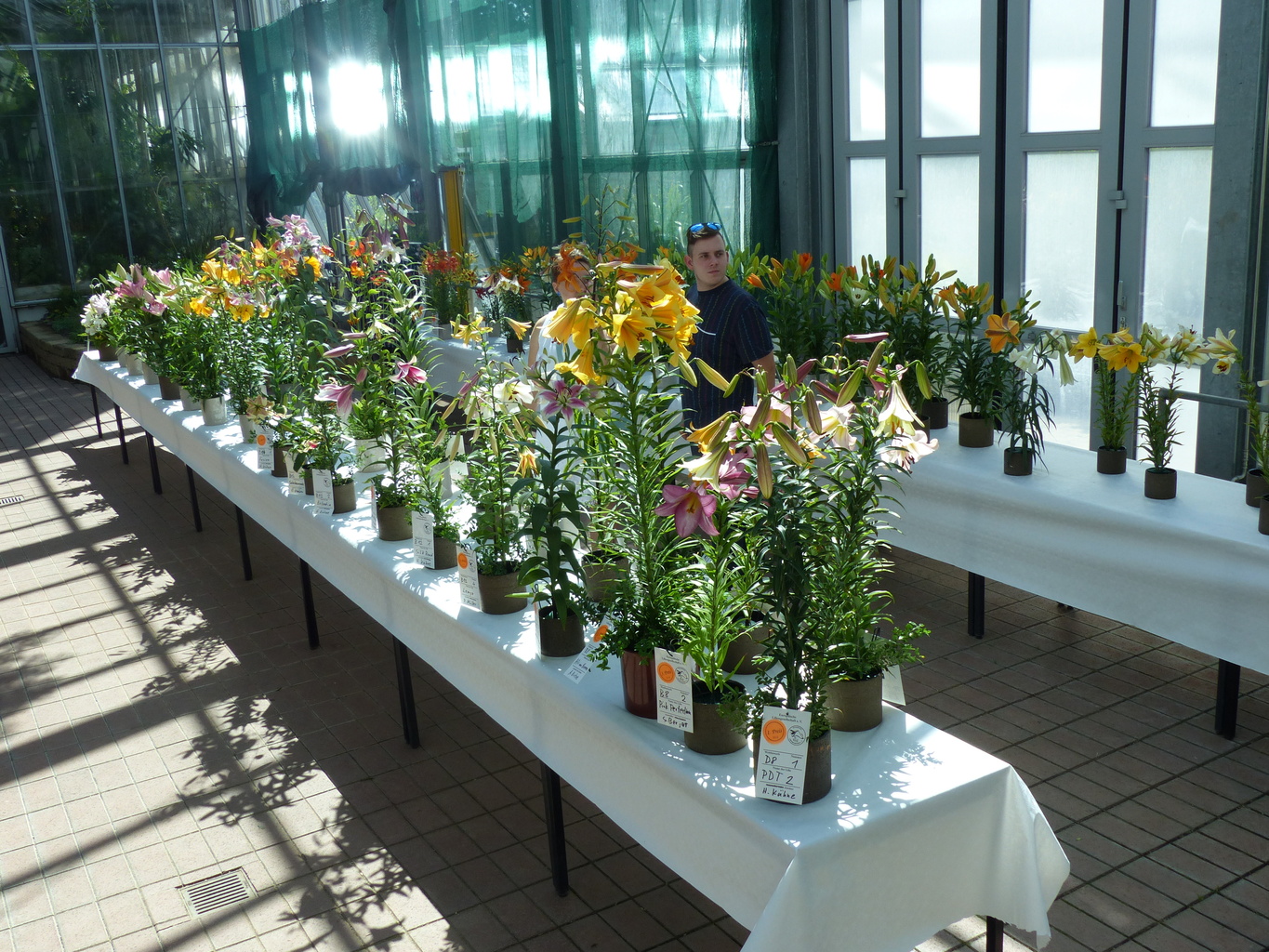 Es ist zu hoffen, dass auf zukünftigen Ausstellungen wieder mehr Exponate gezeigt werden. Um die Ausfälle gegenüber früheren Ausstellungen optisch zu kompensieren, hatten die Ausstellungsleiter auch zugekaufte Schnittlilien als Dekoration aufgestellt. Ich fand es interessant, dass diese Treibhaus-Lilien trotz ihres perfekten Zustands (einwandfreies Laub ohne Fraß-, Transport- und Trockenheitsschäden, fette gleichmäßige Blütenstände usw.) anscheinend dennoch weniger Interesse bei den meisten Ausstellungsbesuchern fanden als die individuelleren Lilien aus unseren Gärten.