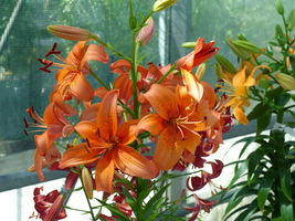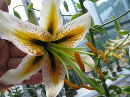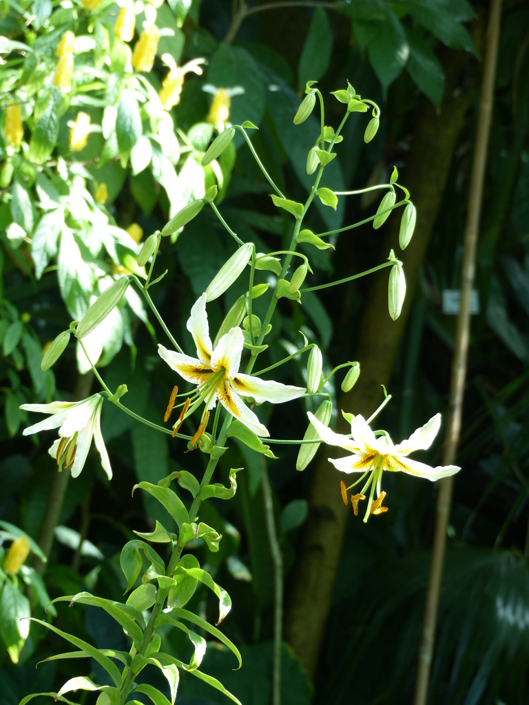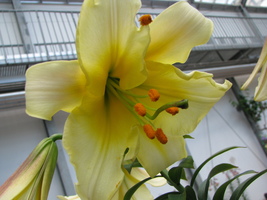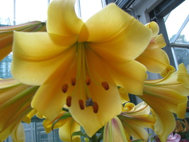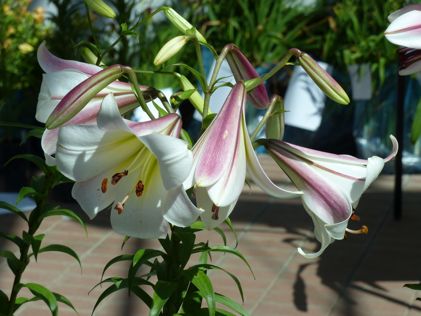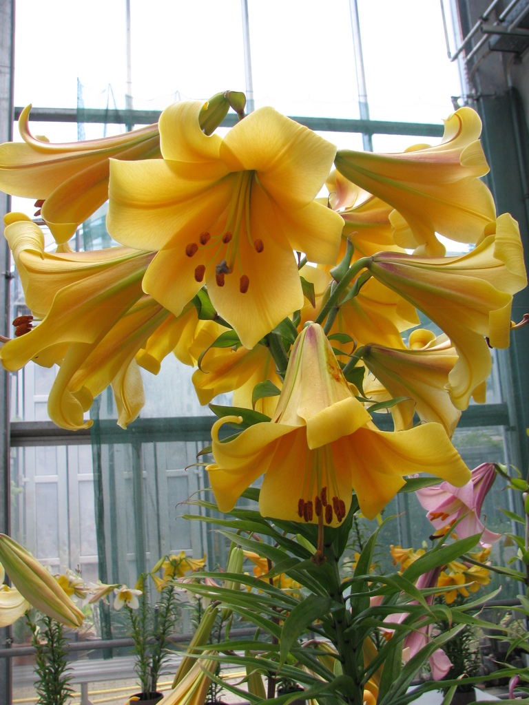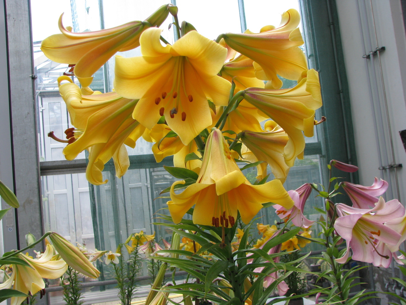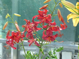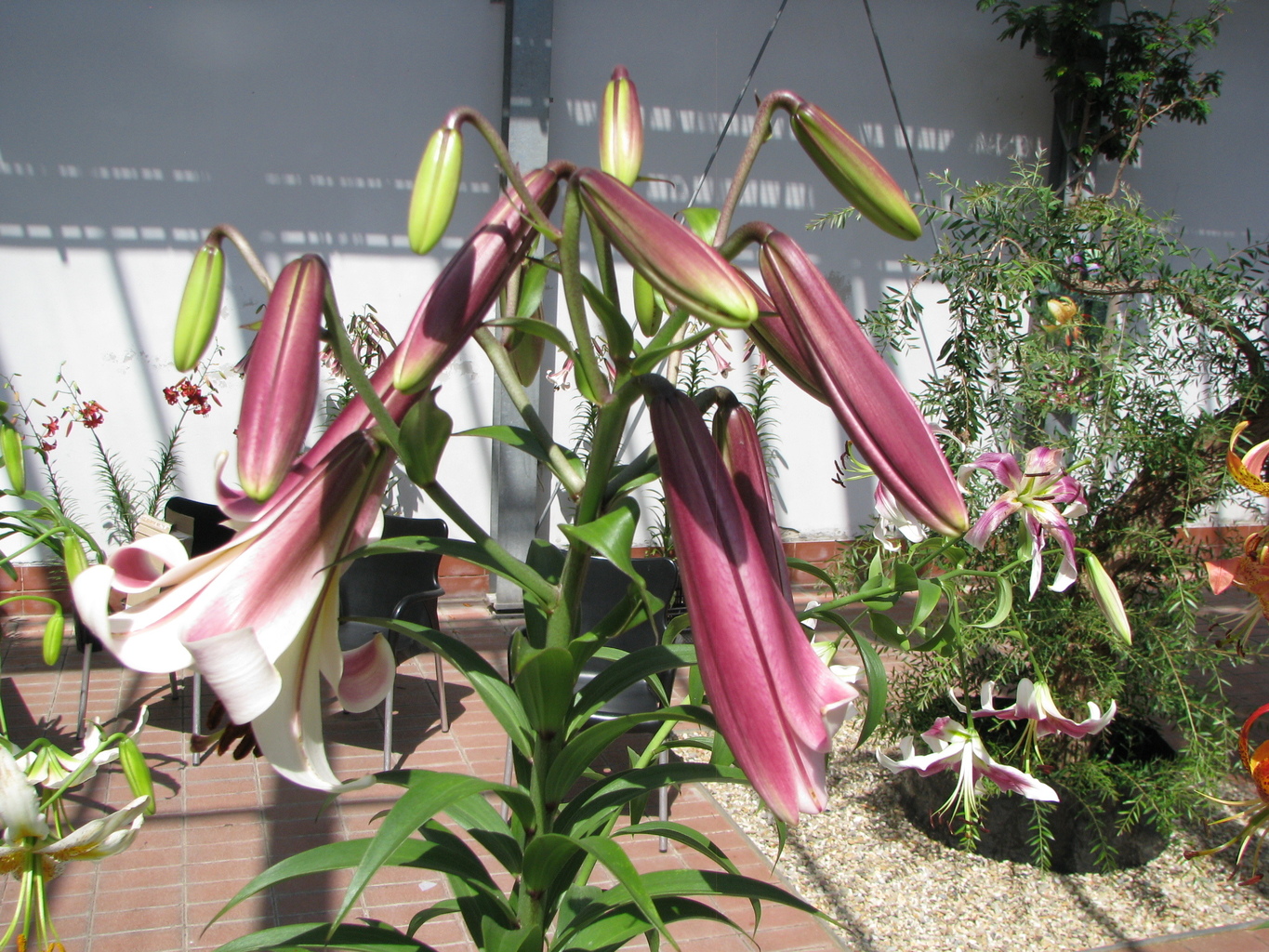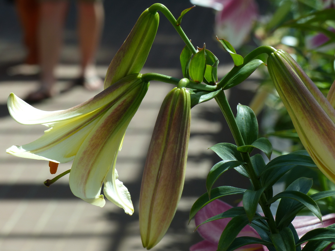 Es ist zu hoffen, dass auf zukünftigen Ausstellungen wieder mehr Exponate gezeigt werden. Um die Ausfälle gegenüber früheren Ausstellungen optisch zu kompensieren, hatten die Ausstellungsleiter auch zugekaufte Schnittlilien als Dekoration aufgestellt. Ich fand es interessant, dass diese Treibhaus-Lilien trotz ihres perfekten Zustands (einwandfreies Laub ohne Fraß-, Transport- und Trockenheitsschäden, fette gleichmäßige Blütenstände usw.) anscheinend dennoch weniger Interesse bei den meisten Ausstellungsbesuchern fanden als die individuelleren Lilien aus unseren Gärten.