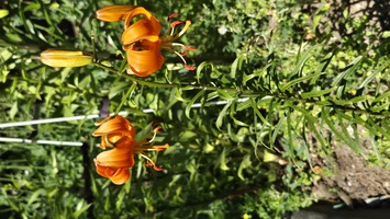Abstammung:Asiatic seedling x asiatic seedlingBeschreibung:Inside brownish orange (172C) with a slight reddish tinge, tips moderate reddish orange (178D), throat and outside brownish orange (172C); numerous, small, moderate purplish red (64A) spots on basal half of each petal; anthers large, pollen dark red (187A); stigma dark purple (83A). Fls l35mm wide; petals 65 x 30mm, not ruffled, tips slightly recurved, with conspicuous midribs. Lvs alternate, 120 x 15mm. Stems 0.9m, dark green, with 8-10fls. Mid June.